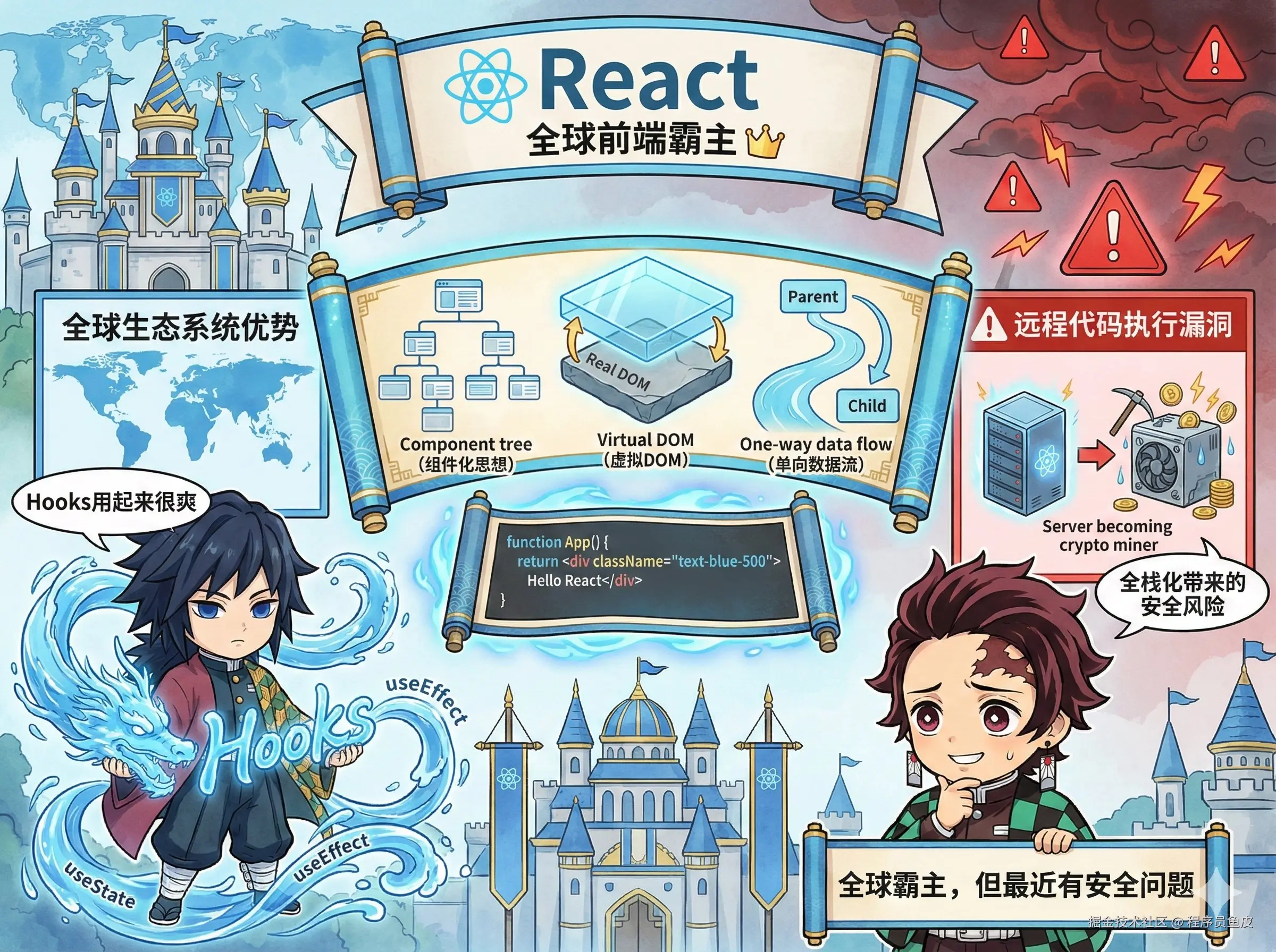 按理说应该给到 “夯”,但是最近 React 服务端组件曝出了一个严重的远程代码执行漏洞,我们团队好几个项目都中招了,服务器沦为矿机、让我们被迫加班。