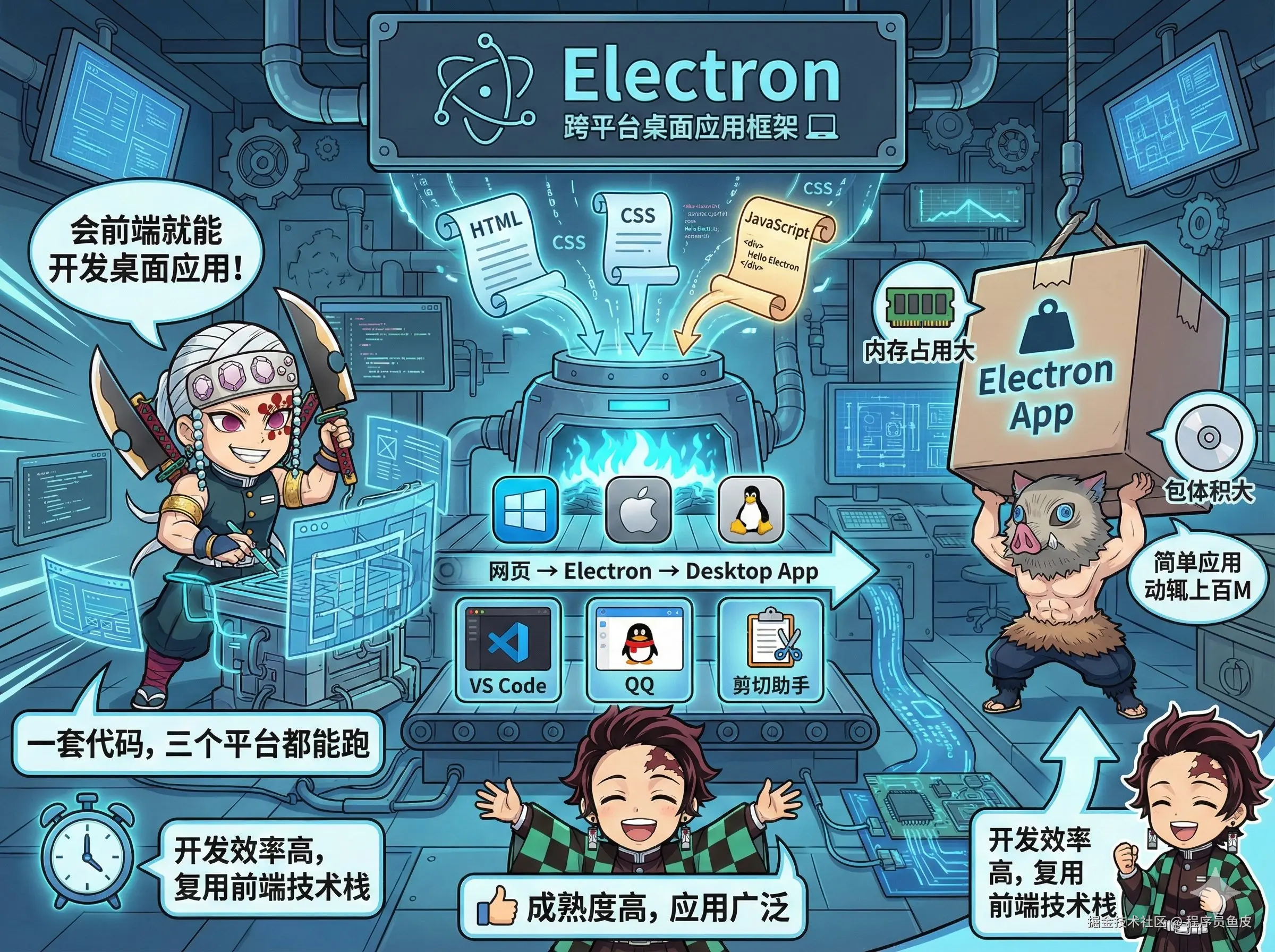 跨平台桌面应用框架。如果你会前端,用 Electron 就能开发桌面应用,一套代码 Windows、Mac、Linux 上都能跑。VS Code、QQ、还有我们的剪切助手软件都是用 Electron 写的。