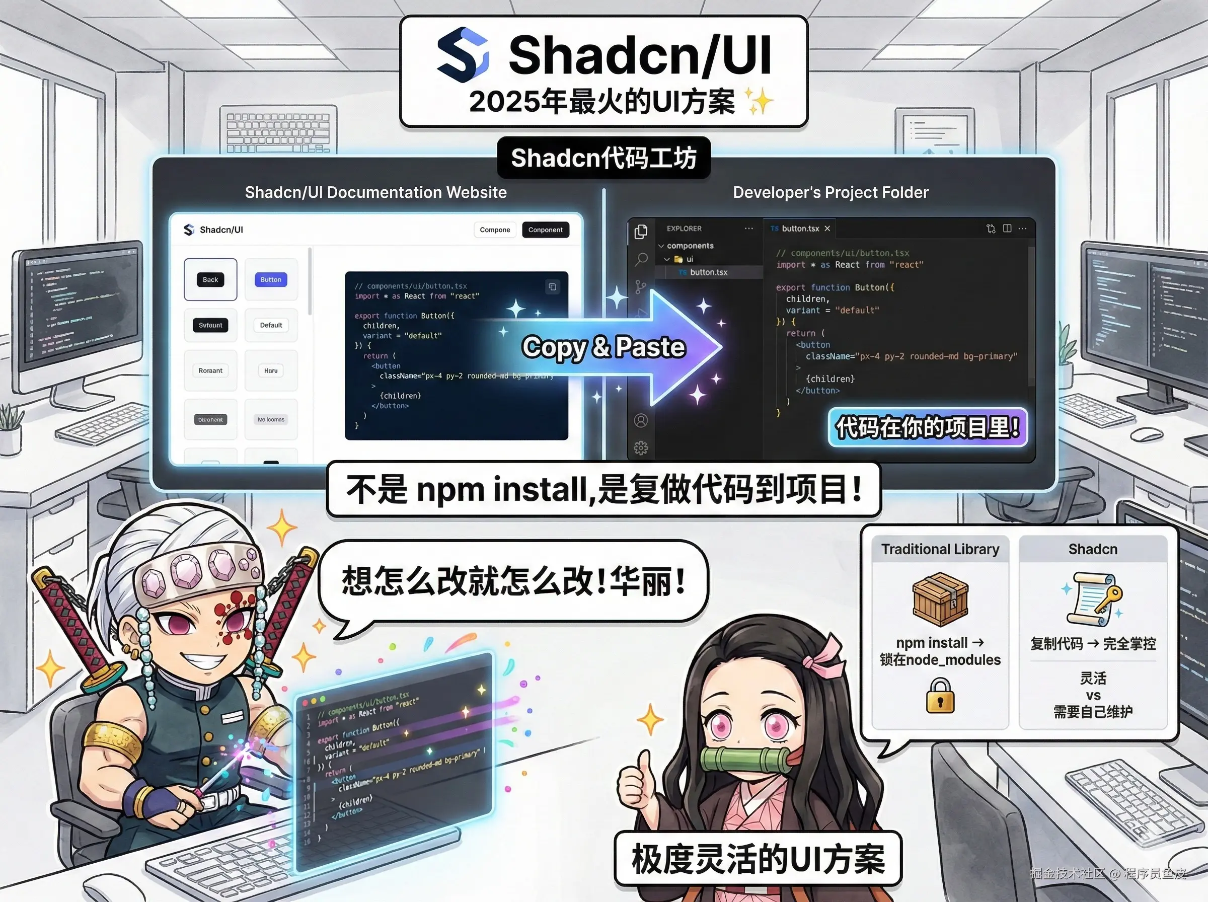 可能是 2025 年最火的 UI 方案。注意,它不是一个组件库,而是一套 可复制粘贴的代码集合。不需要使用 npm 来安装依赖,而是直接把组件代码复制到你的项目里。