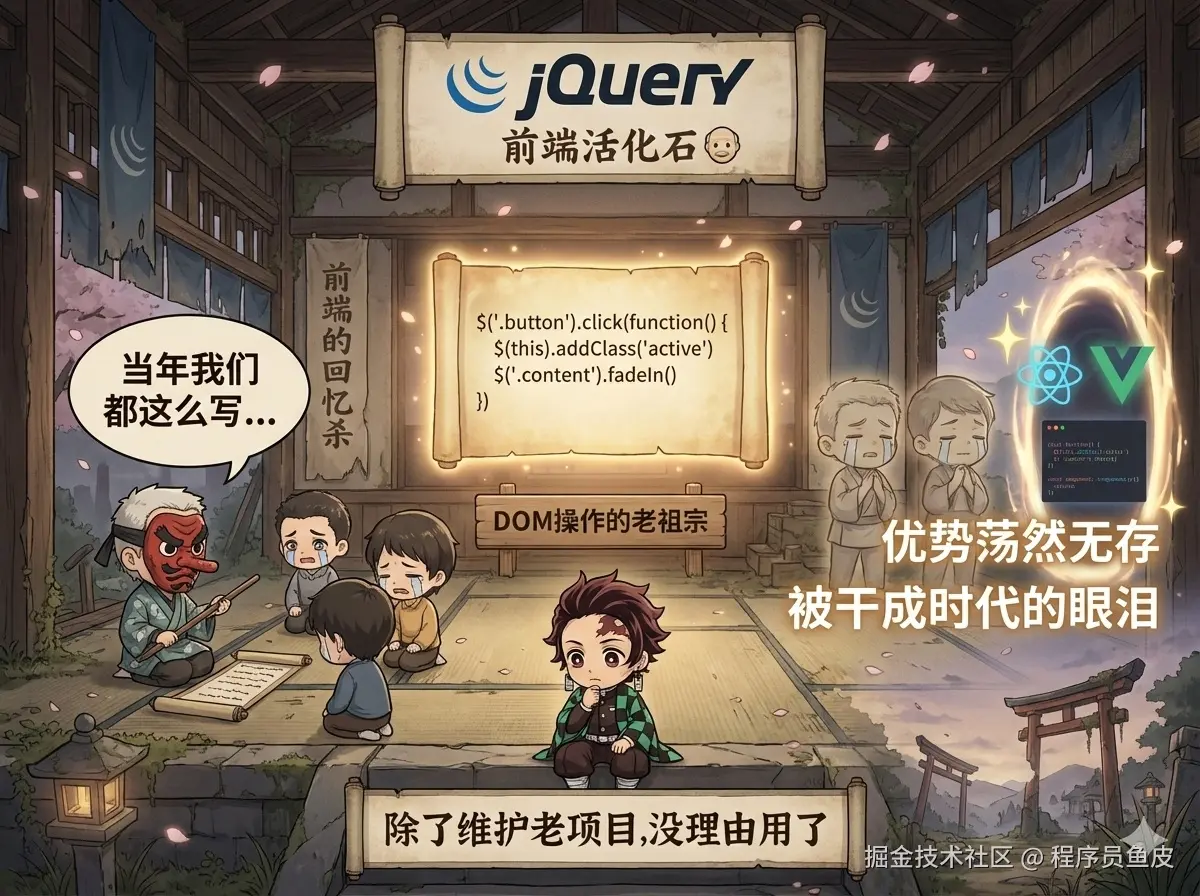 如今随着 React、Vue 这些组件化框架的崛起,以及浏览器原生 API 的完善,jQuery 的优势荡然无存,已经被干成时代的眼泪了。现在除了维护老项目外,基本上没有理由用 jQuery 了。给到 拉!