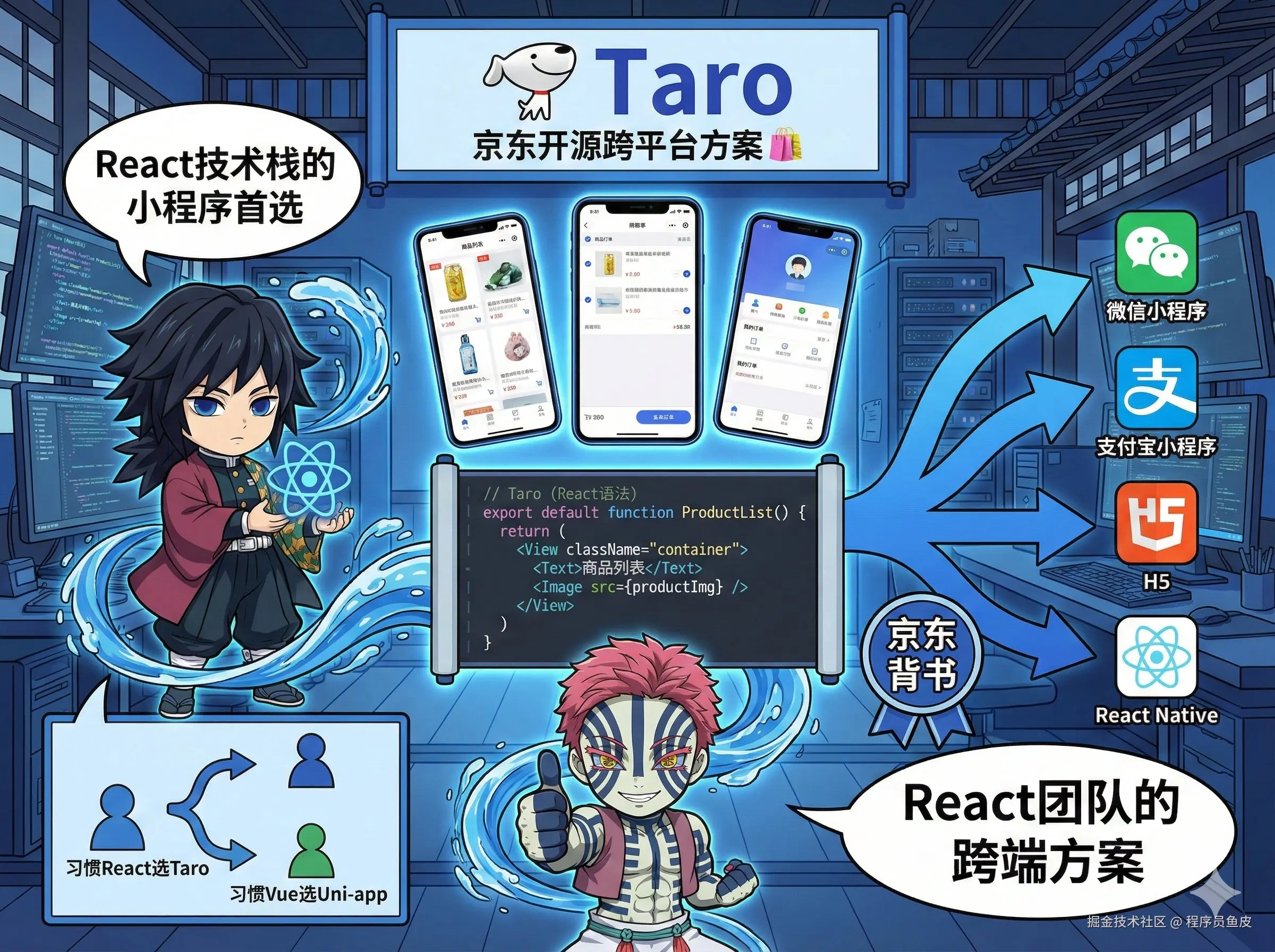 京东开源的跨端解决方案,React 技术栈的小程序开发首选。跟 Uni-app 类似,也是一套代码多端运行。