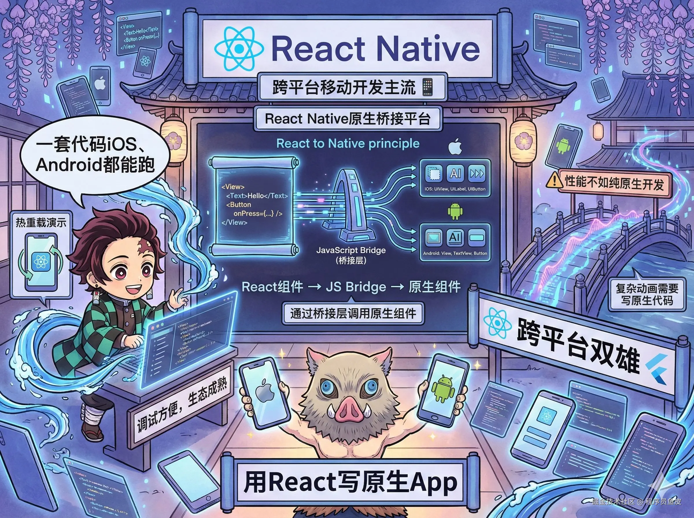 跨平台移动开发的主流选择,跟 Flutter 并称跨平台双雄。用 React 语法写原生 App,一套代码 iOS、Android 都能跑。而且支持热更新,调试很方便,生态也很成熟。