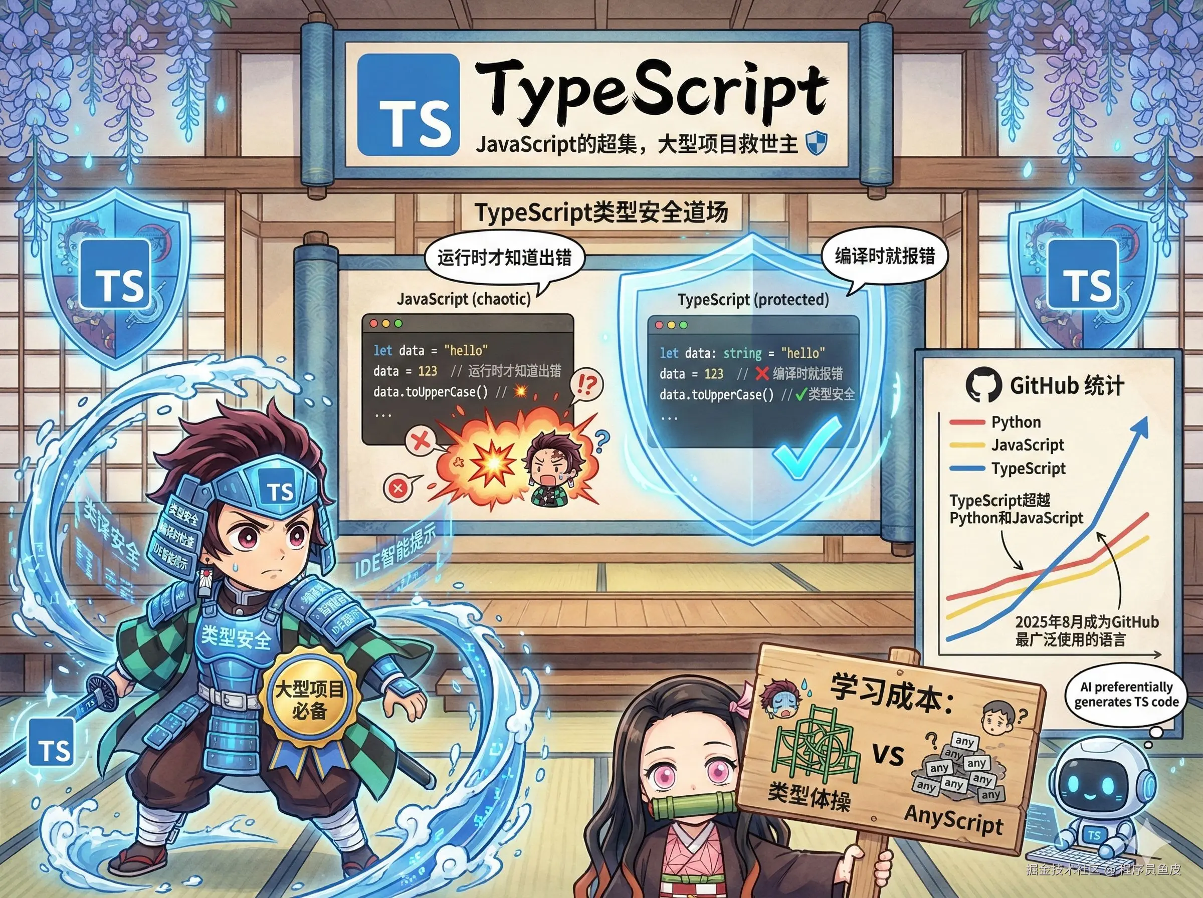 TypeScript 是 JavaScript 的超集,前端大项目的救世主。以前写 JS,变量类型全靠猜,运行时才知道哪里报错。TypeScript 给 JS 加上了类型系统,通过类型安全、IDE 智能提示、编译时检查,解决了 JS 的类型混乱问题。大型项目没有 TypeScript 简直寸步难行。
