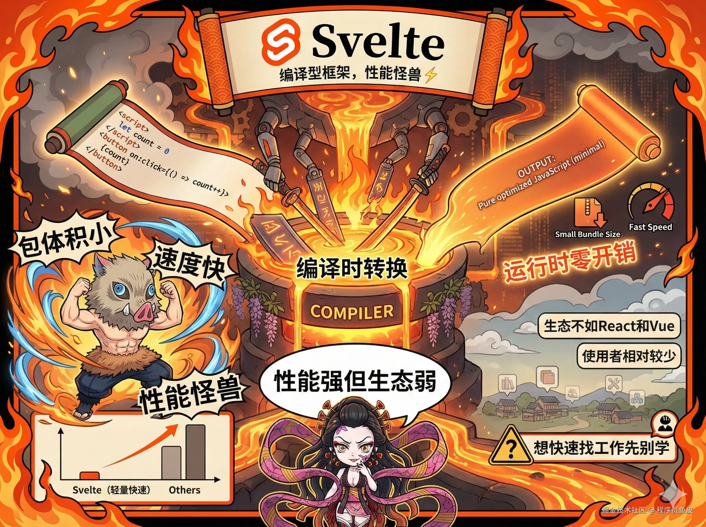 编译型前端框架,性能怪兽。它在编译时把组件转成原生 JavaScript,运行时没有框架开销,包体积小、速度快。