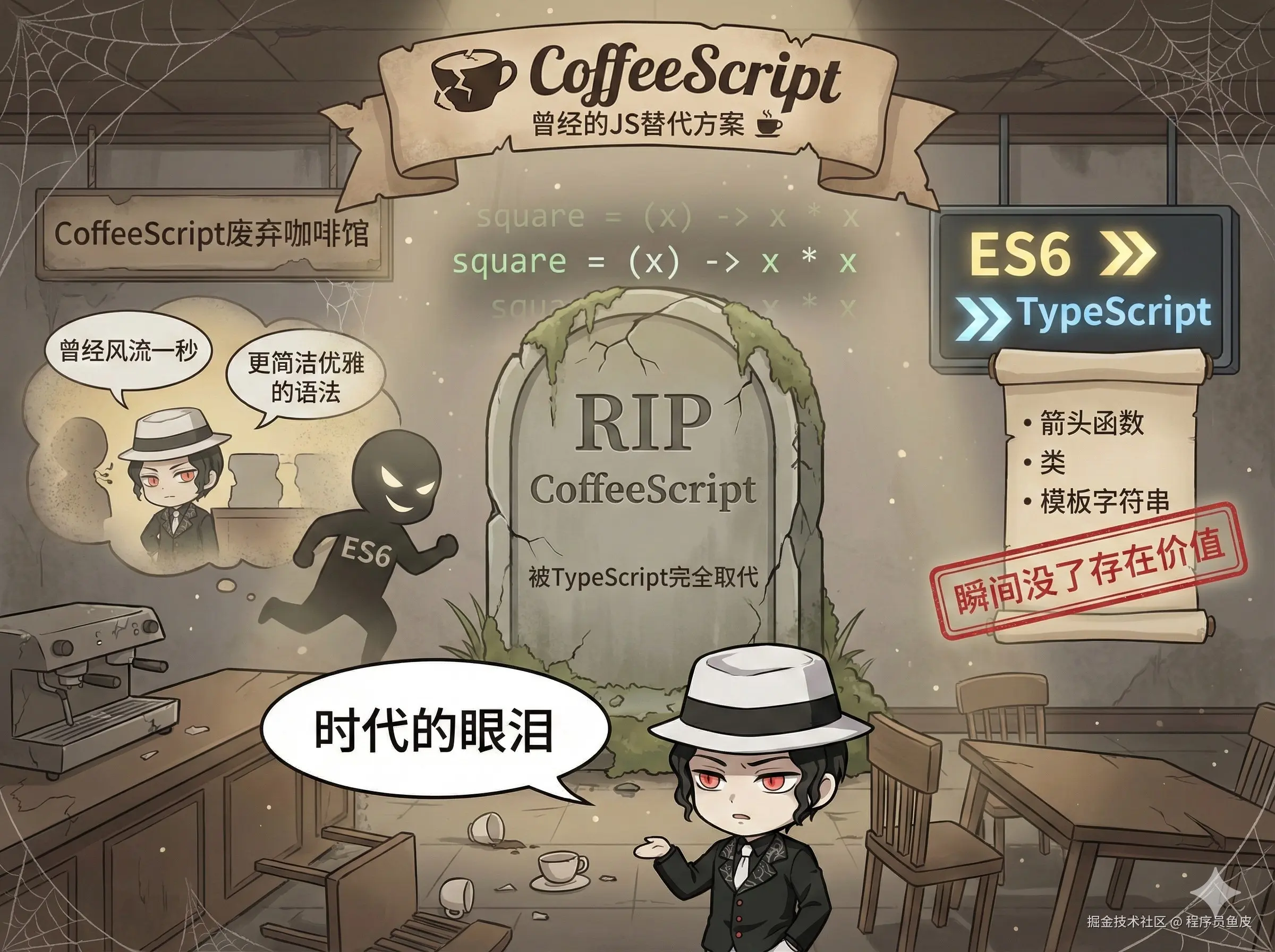 这是曾经风流一秒的 JavaScript 替代方案,它的理念是用更简洁优雅的语法写代码,然后编译成 JavaScript。但 ES6 出来之后,JS 自己支持了箭头函数、类、模板字符串这些特性,CoffeeScript 瞬间没了存在价值,被 TypeScript 完全取代,给到 拉!