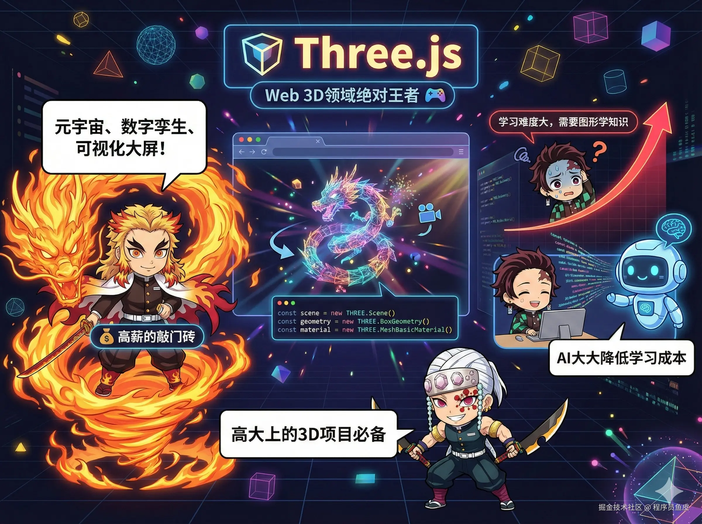 缺点是学习难度很大,需要一定的图形学知识。不过现在有 AI 了,可以直接让 AI 帮你生成复杂的 3D 场景代码,学习成本大大降低。给到 人上人。