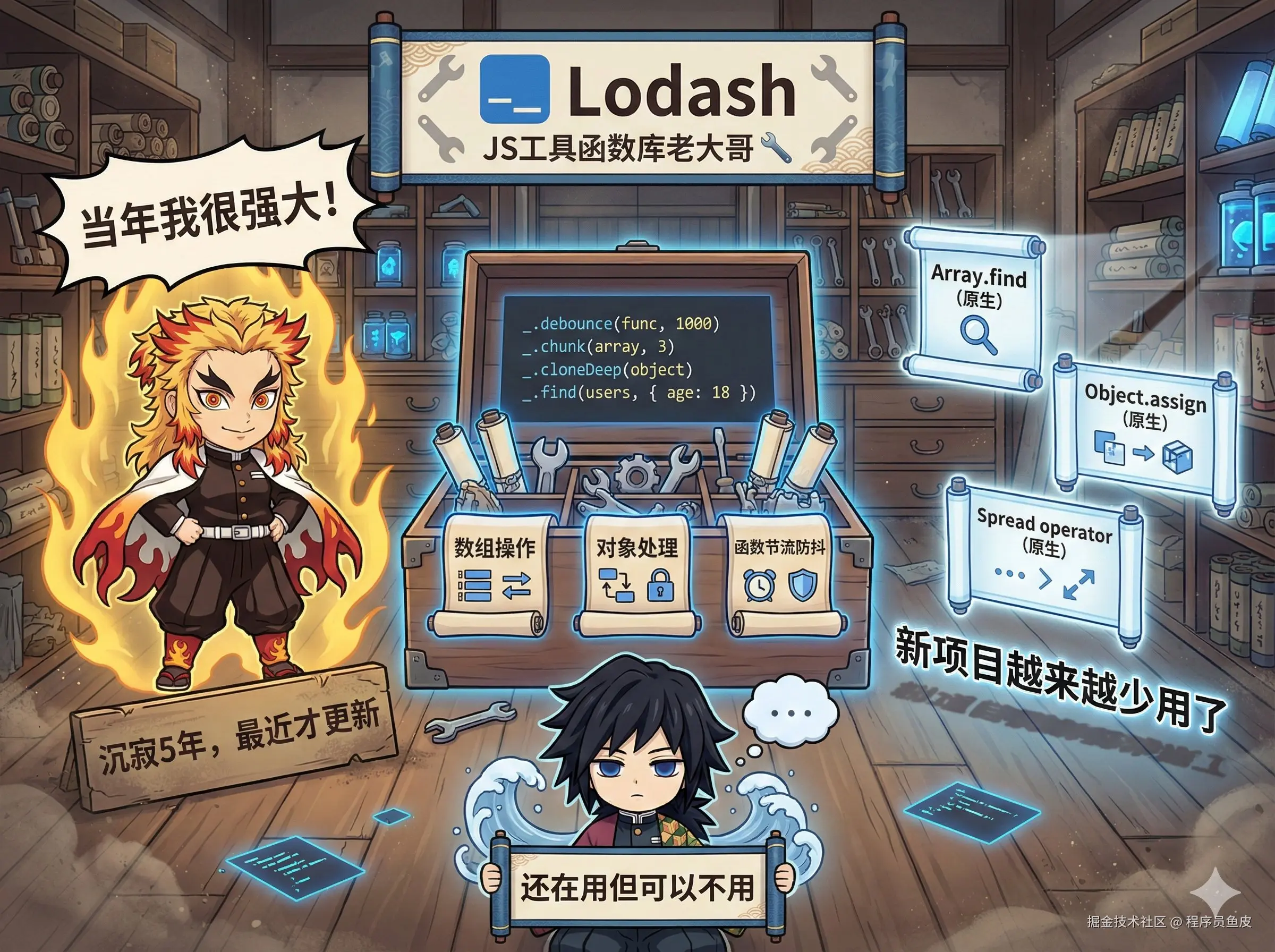 但问题是,Lodash 沉寂了整整 5 年,直到最近才更新了一个小版本。而且现在 ES6+ 已经原生支持了很多功能,像 Array.find、Object.assign、展开运算符等,新项目越来越少主动引入 Lodash 了。属于 “还在用但可以不用,并且不推荐新项目用” 的状态,给到 NPC。