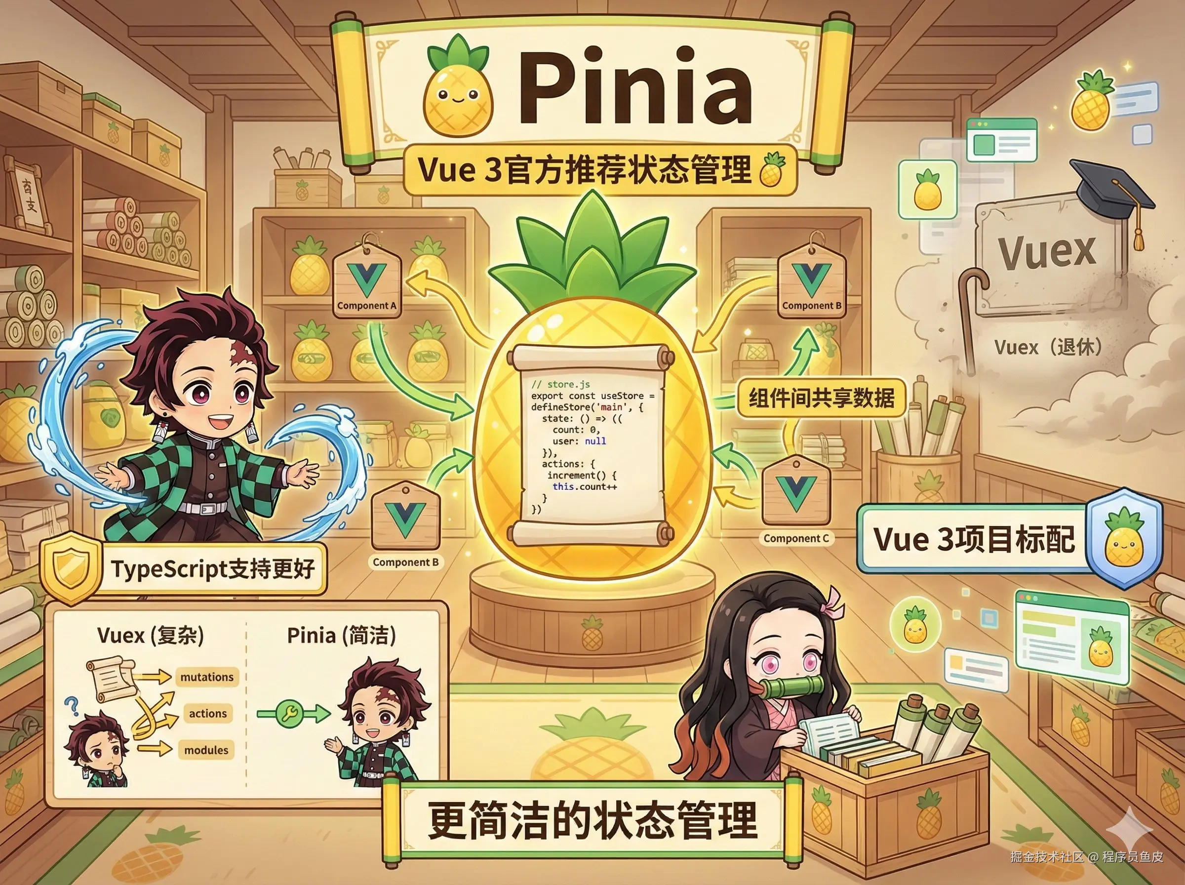 现在 Vue 3 项目标配都是 Pinia,Vuex 基本退休了。给到 人上人。