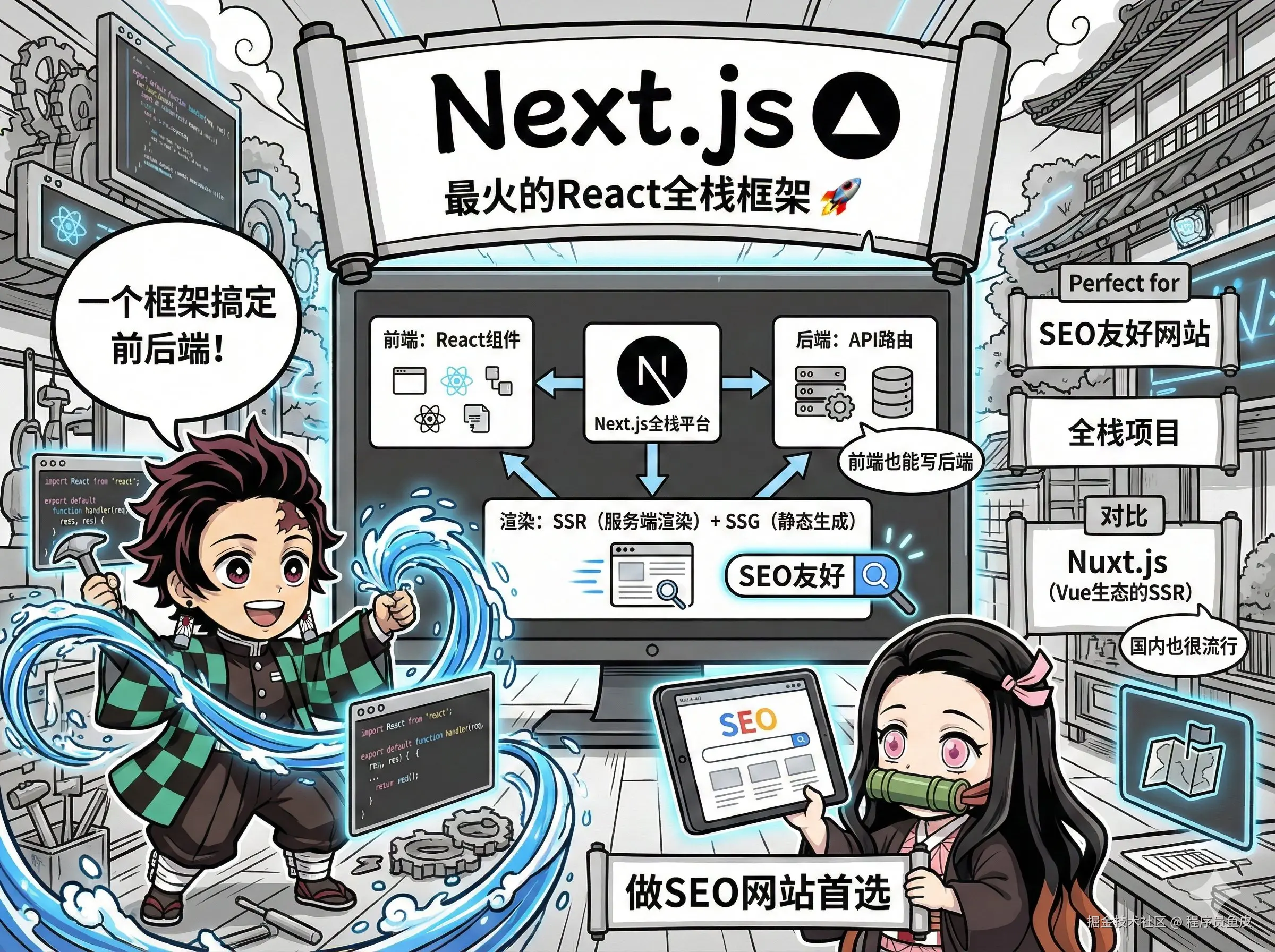 目前最火的 React 全栈框架,支持服务端渲染(SSR)、静态站点生成(SSG)、API 路由等功能,让前端也能写后端接口。