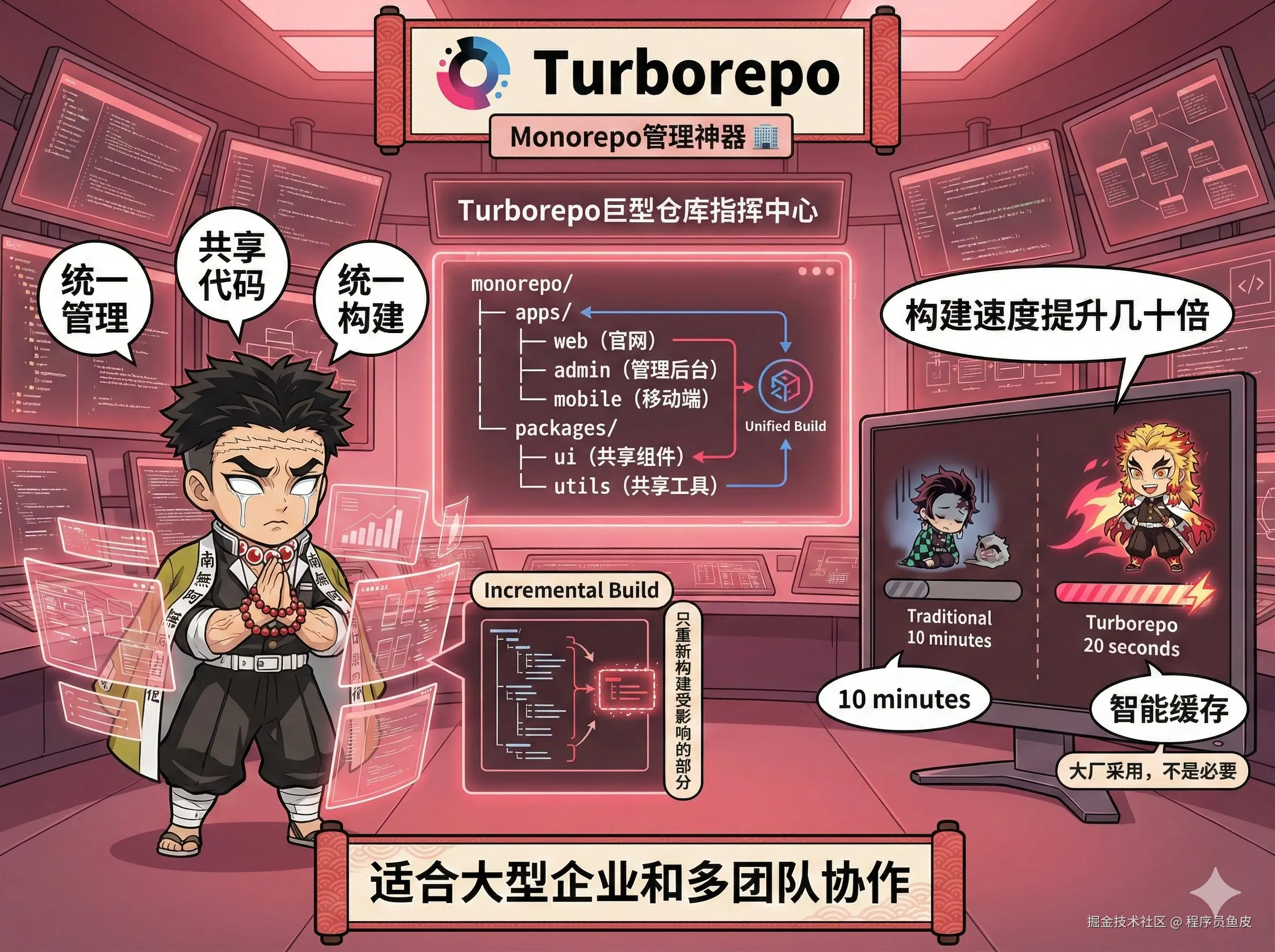 Turborepo(还有 Nx)能帮你管理这种复杂的项目结构,提供增量构建、智能缓存、任务编排等功能。改了一个包,只重新构建受影响的部分,构建速度甚至可以提升几十倍。