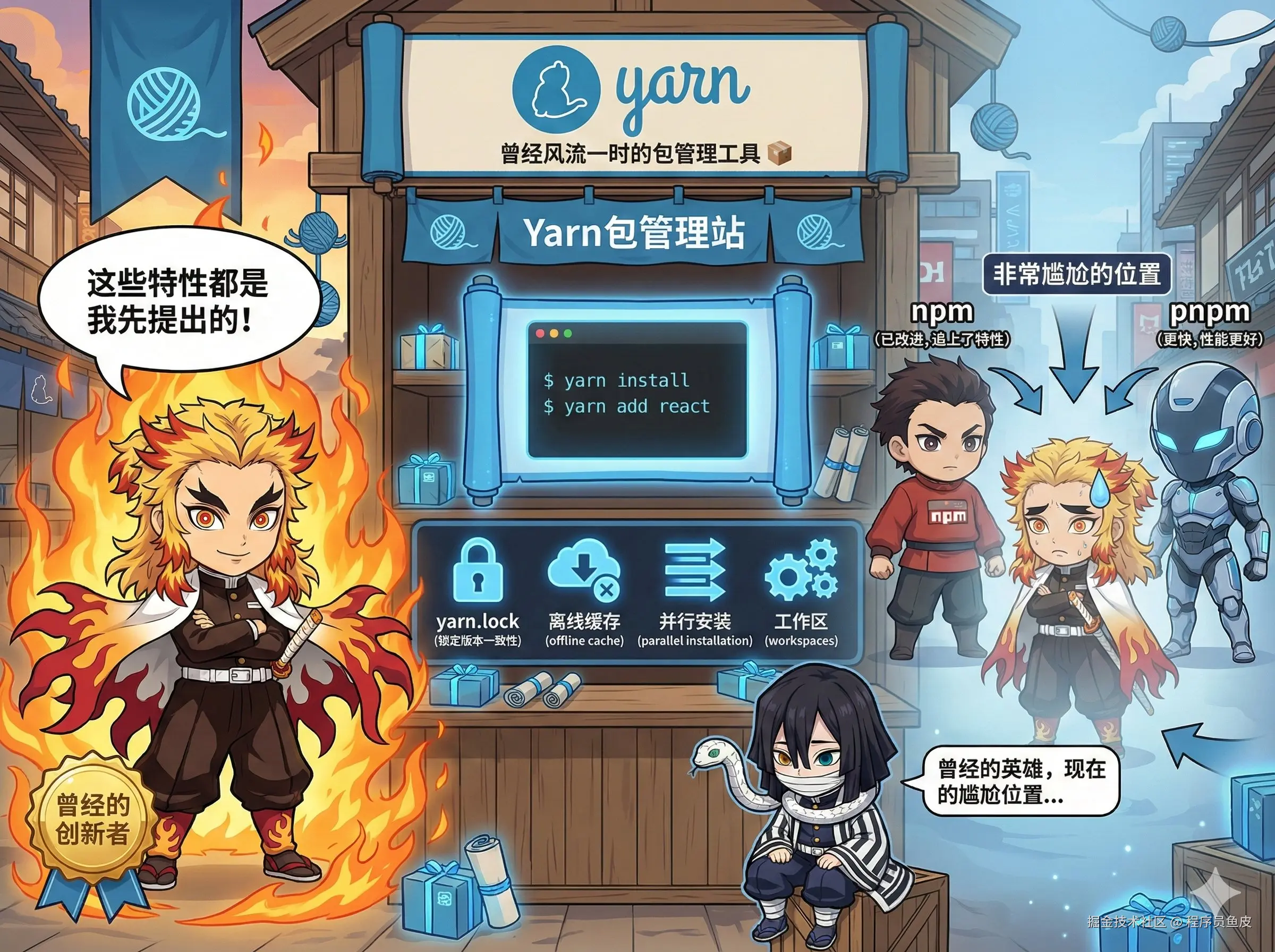 但是 npm 后来也跟进了这些特性,而 pnpm 在性能上又超越了 Yarn。所以导致现在的 Yarn 处于一个非常尴尬的位置,给到 NPC。