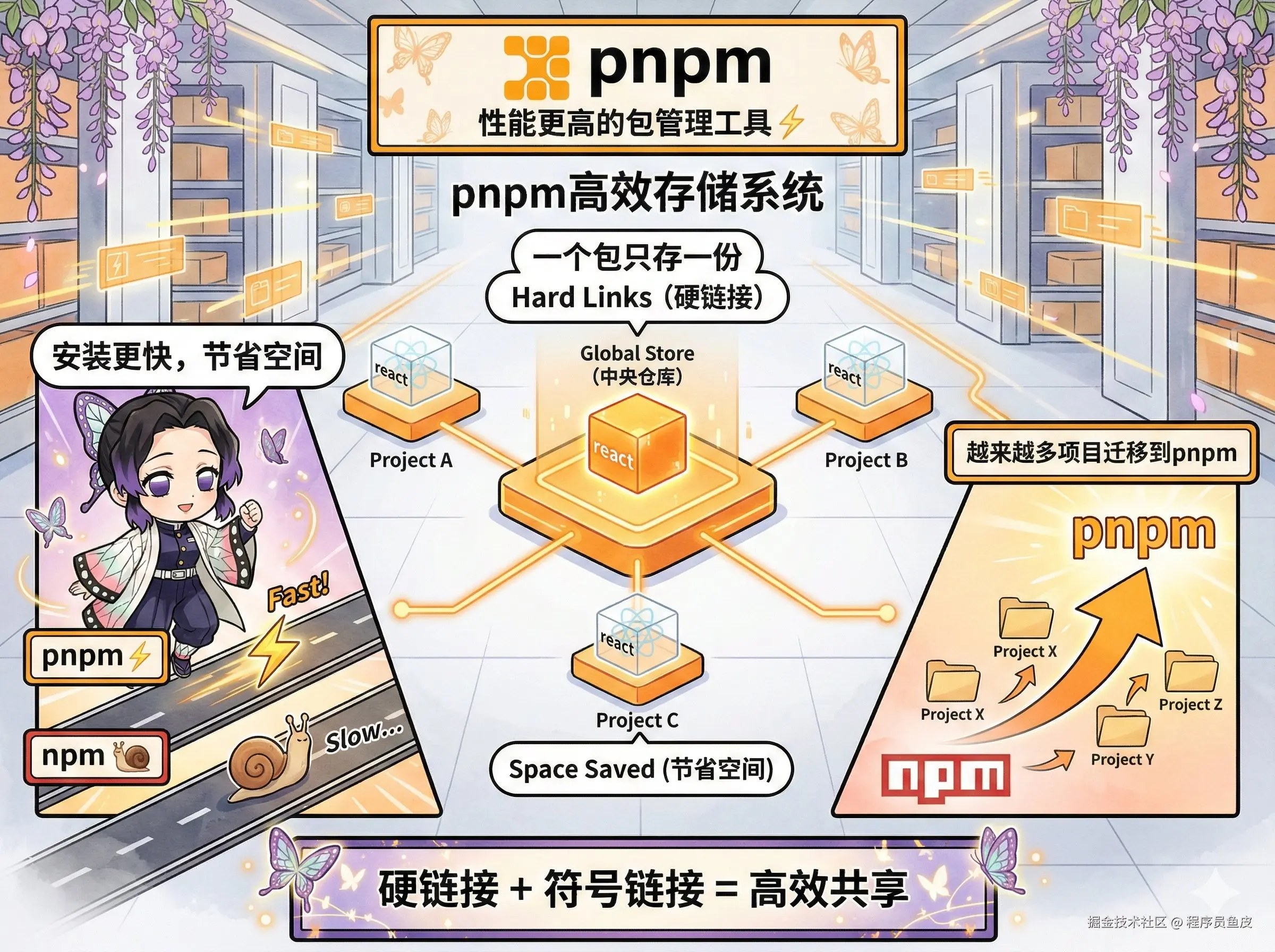 性能更高的 npm,目前最高效的包管理工具。它用硬链接和符号链接的方式共享依赖,一个包只存一份,多个项目共用,从而节省空间、安装更快。因此越来越多的项目都在迁移到 pnpm,给到 夯!