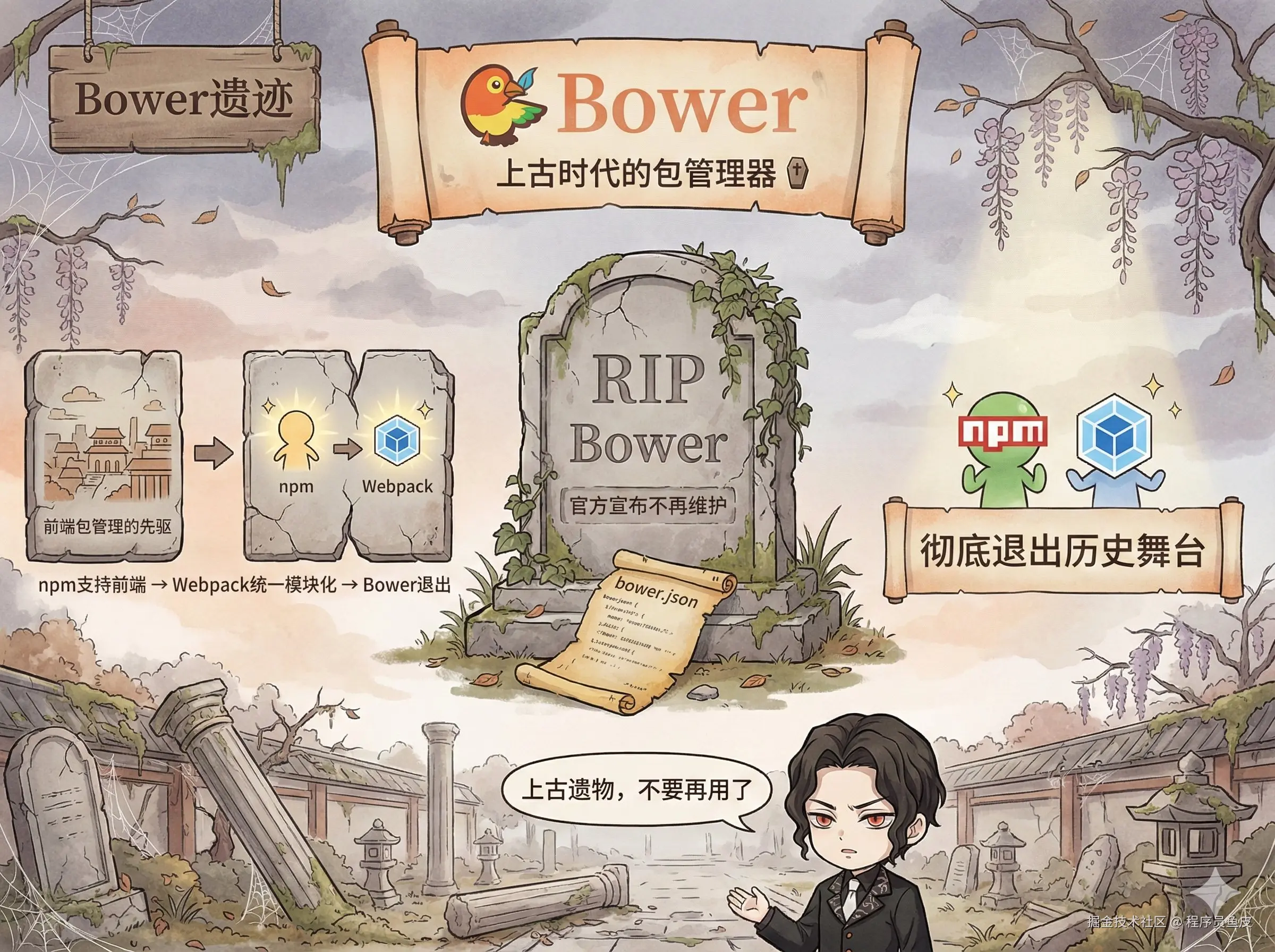 上古时代的前端包管理器,老前辈了。但自从 npm 支持前端包管理、Webpack 统一了模块化方案之后,Bower 就彻底退出历史舞台了。官方都宣布不再维护,给到 拉!