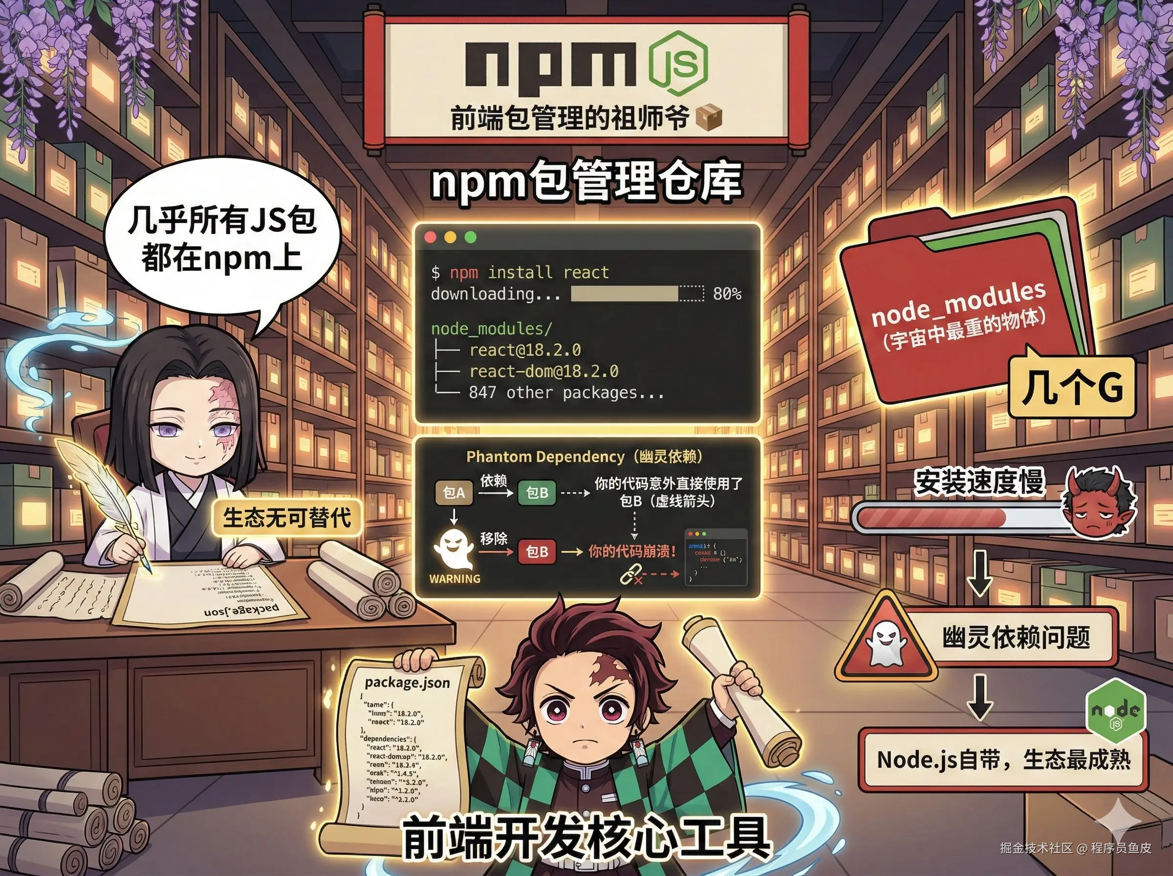 前端包管理的祖师爷,帮你安装和管理项目依赖的工具。由于安装 Node.js 就自带 npm,所以 npm 生态特别成熟,几乎所有的 JS 包都会发布到 npm。