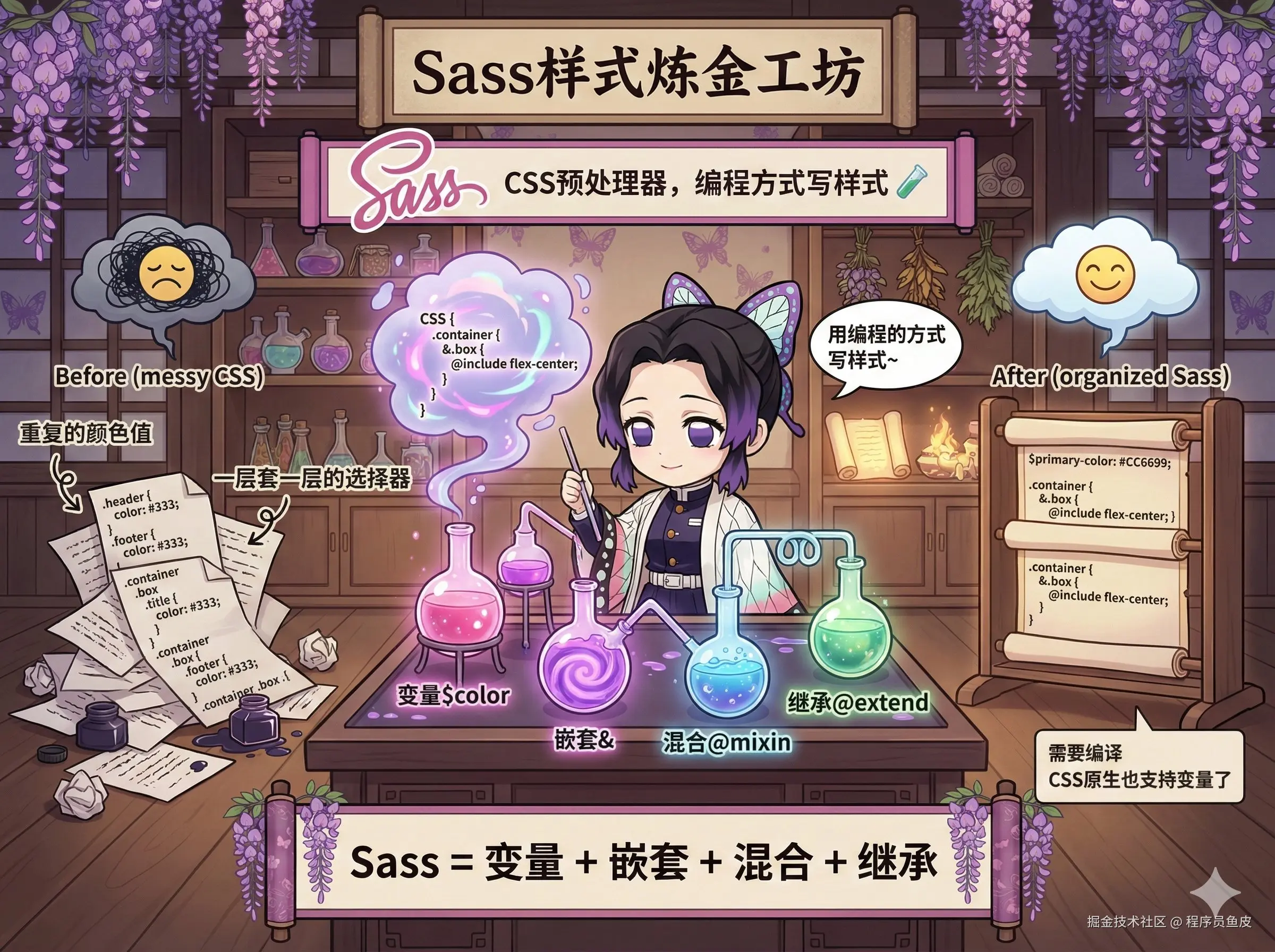 CSS 预处理器,让你用编程的方式写样式。写过原生 CSS 的都知道,一堆重复的颜色值、一层套一层的选择器,维护起来非常头疼。Sass 支持变量、嵌套、混合、继承等高级特性,可以解决这些问题。