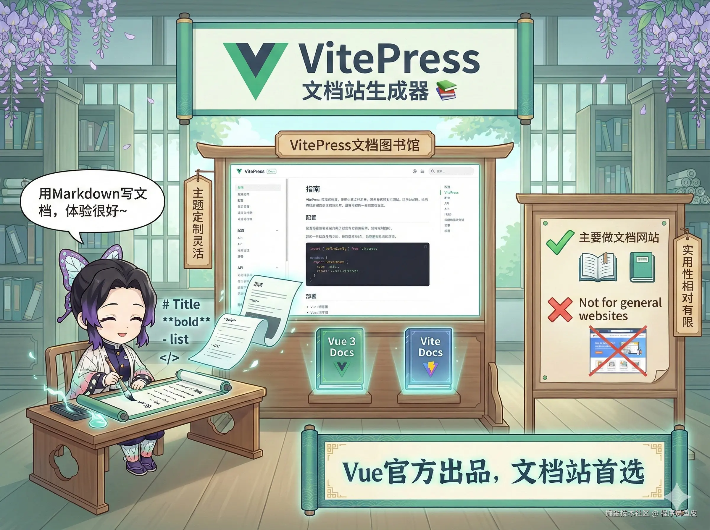 Vue 官方出品的文档站生成器,VuePress 的继任者。如果你要搭建技术文档网站,用 Markdown 来写文档,那么 VitePress 的体验很好,主题定制也灵活。Vue 3 和 Vite 的官方文档都在用它。