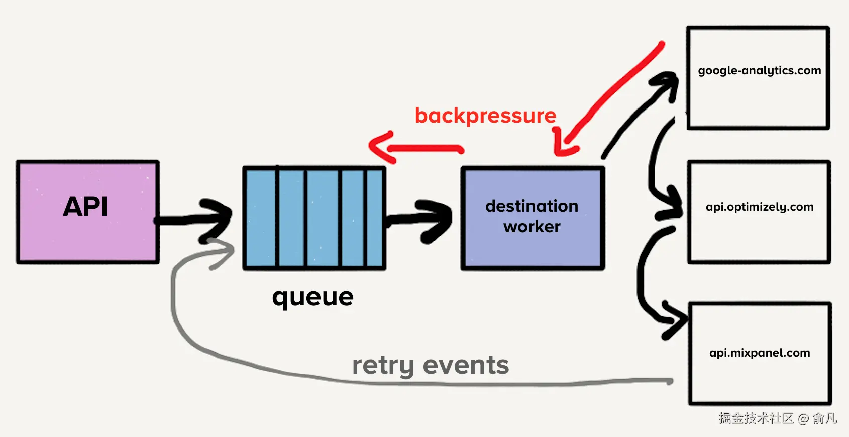 上图展示了队列包含最新事件以及可能的多次重试事件,涵盖所有目的地,导致 队列头阻塞(head-of-line blocking)。也就是说,在这种情况下,如果某个目的地变慢或宕机,重试会淹没队列,导致所有目的地都出现延迟。