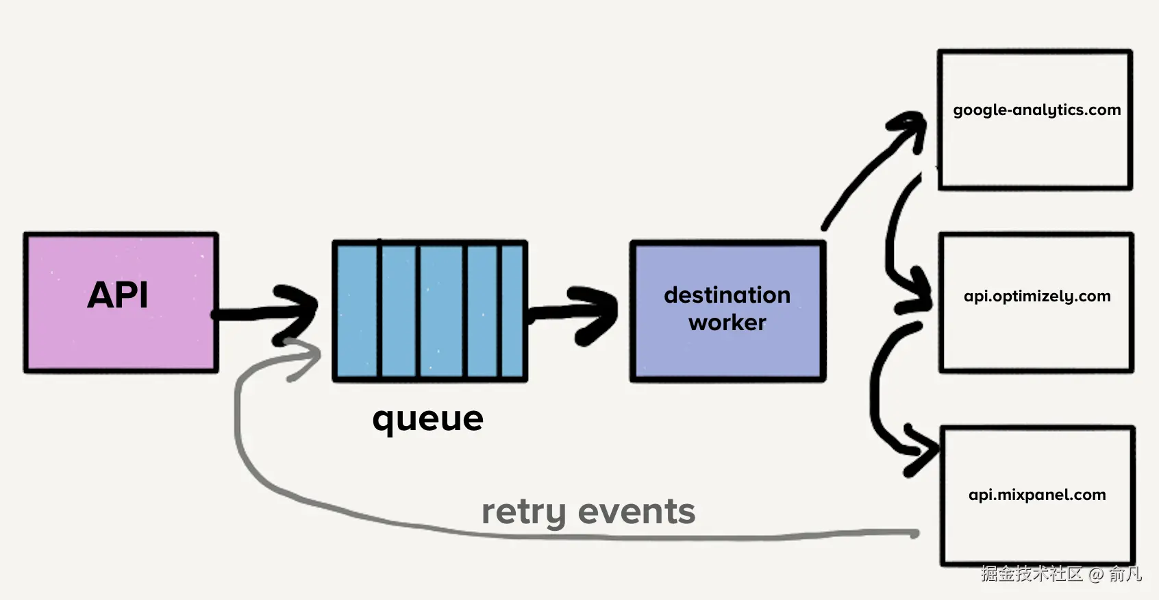 消费队列中的事件时,会检查客户设置以决定哪些目的地应接收该事件,随后将其依次发送到每个目的地 API。这很方便,因为开发者只需将事件发送到单个端点 —— Twilio Segment 的 API,而无需对每一个都构建集成,Twilio Segment 会负责向每个目标端点发送请求。