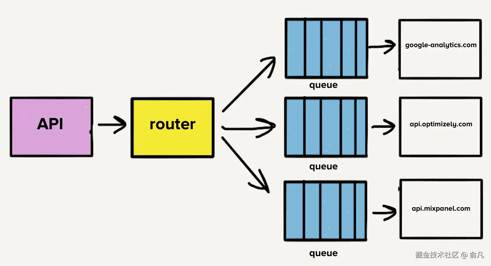 多年前这款产品刚推出时,架构非常简单,有一个可以导入事件并将其转发到分布式消息队列的 API,事件是由网页或移动应用生成的 JSON 对象,包含用户及其操作信息。