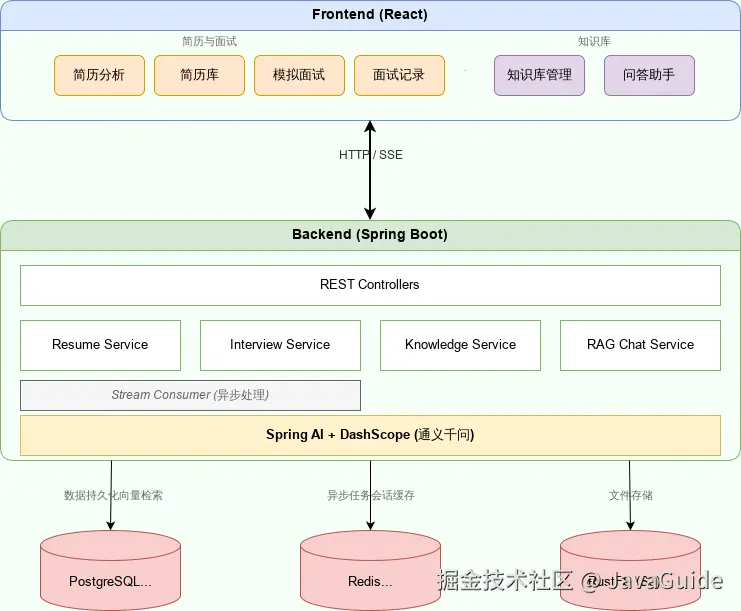 你好,我是 Guide。利用元旦假期,我开源了一个基于 Spring Boot 4.0 + Java 21 + Spring AI + PostgreSQL + pgvector + RustFS + Redis 的大模型项目,实现了简历智能分析、AI 模拟面试、知识库 RAG 检索等核心功能。