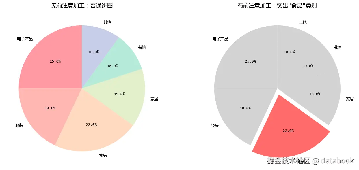 左图中,所有类别视觉权重相同,读者需要阅读标签或百分比才能找到特定类别。