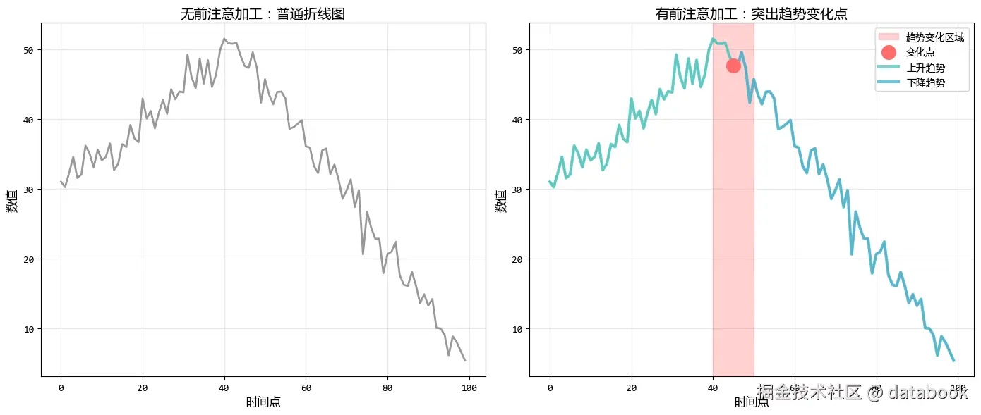 前注意加工的好处:就像在道路地图上标记出转弯处,读者能立即看到趋势变化的关键时刻。