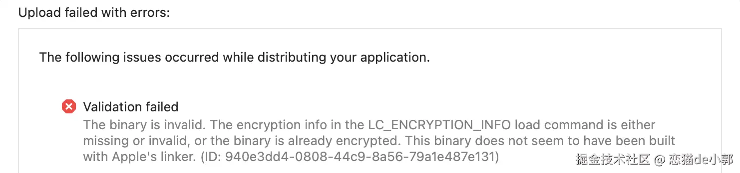 如果你近期已经升级到 3.38.1 之后的版本,包括 3.38.5 ,你就有概率发现,打包提交 iOS 的包会出现 The binary is invalid 的相关错误,简单来说,就是App Store 拒绝了某个二进制文件,因为它包含了无效的内容。