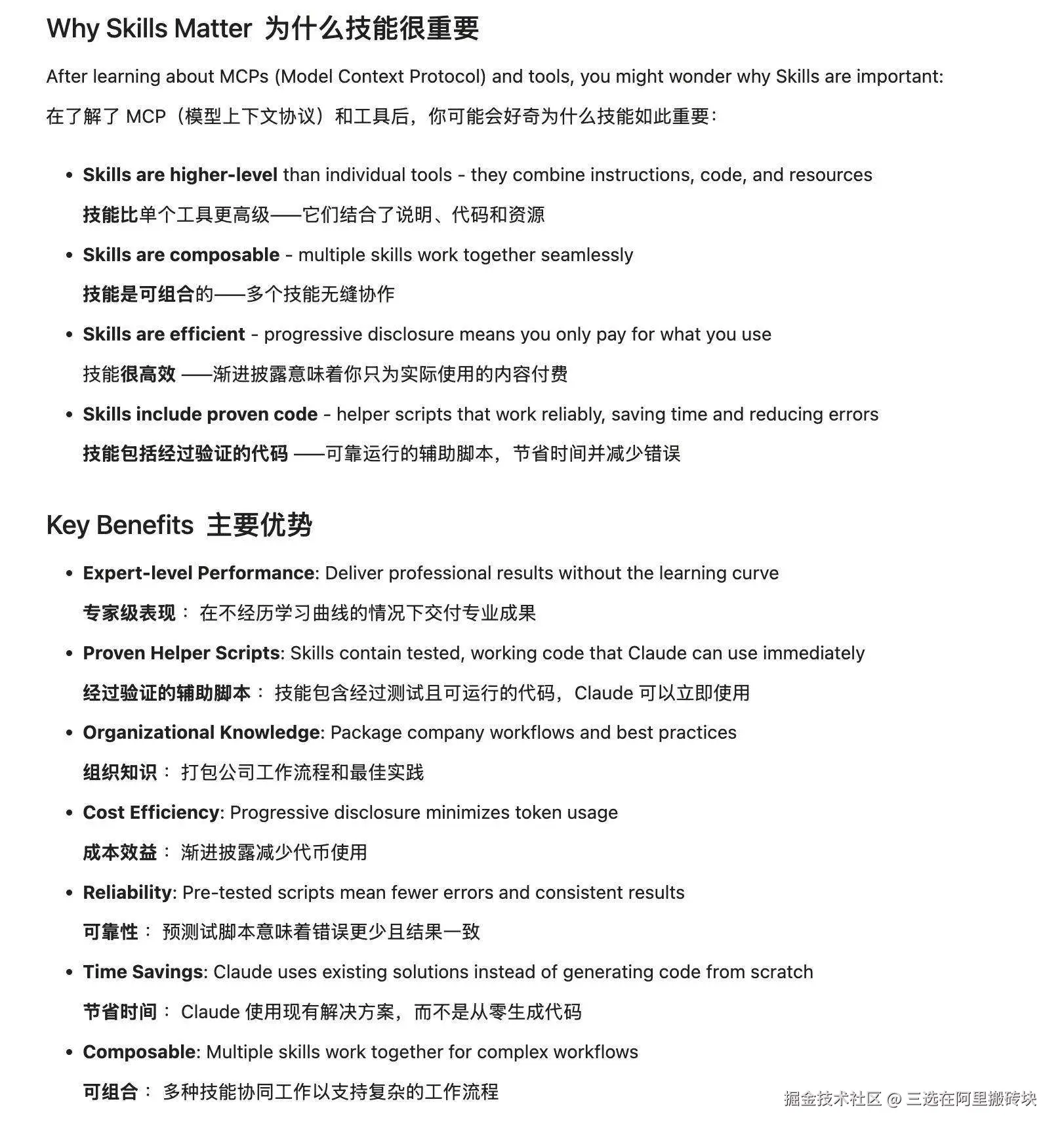 更加内聚:一个Skill就是一个领域信息的汇总渐进式加载:一开始读取需要的Skill.md,然后再渐渐读取需要的script等文件。更少的上下文意味着更少的token以及更少的无关信息干扰被验证的代码:将一些已经被验证的流程变成代码接入,准确率有保证