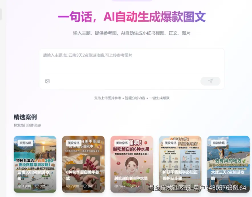 做小红书的宝子们谁懂啊?熬了3小时写好文案,排版调格式又耗1小时,好不容易搞定还怕踩违禁词限流;想抄爆款思路,翻遍平台找灵感却毫无头绪,明明内容不差,流量却始终上不去。其实不是你能力不行,只是少了一款精准适配小红书生态的创作工具。今天就给大家带来一款全能内容创作助手的深度体验,帮你把图文创作效率直接拉满。