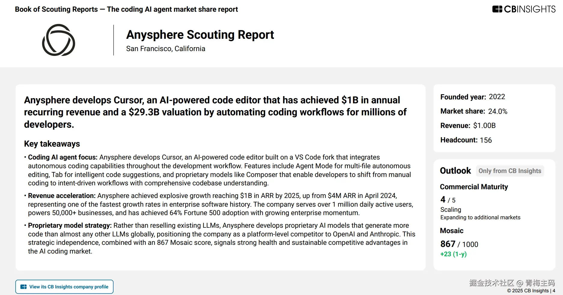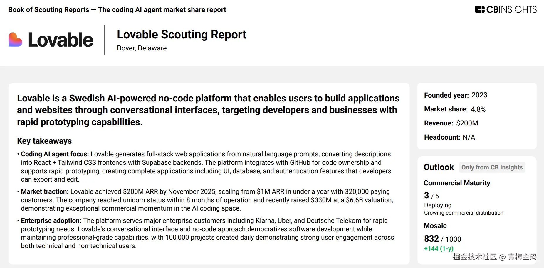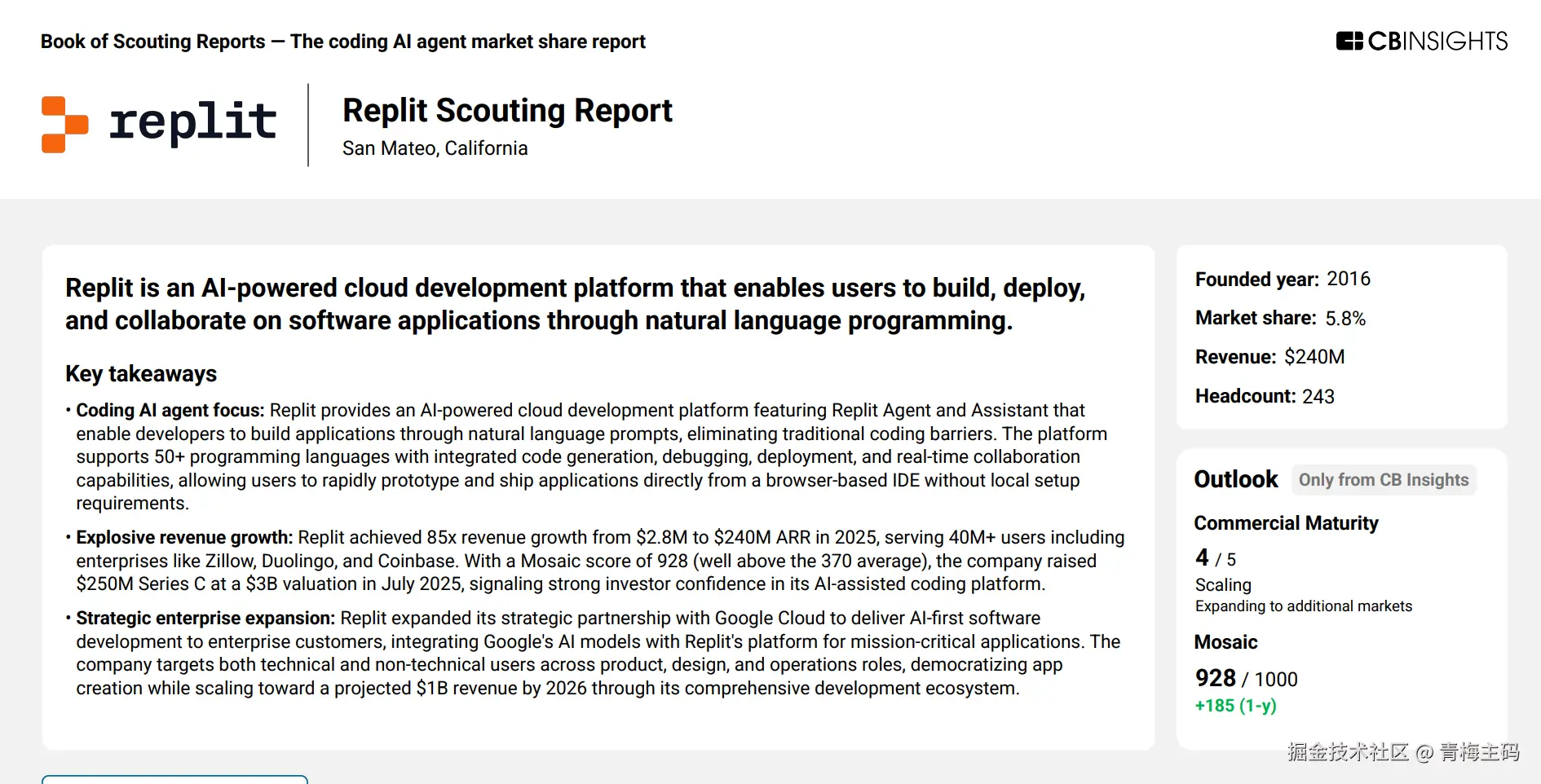 CB Insights 的这份报告清晰勾勒出编码AI代理市场的最新格局:头部效应明显,但第二梯队仍有巨大机会。