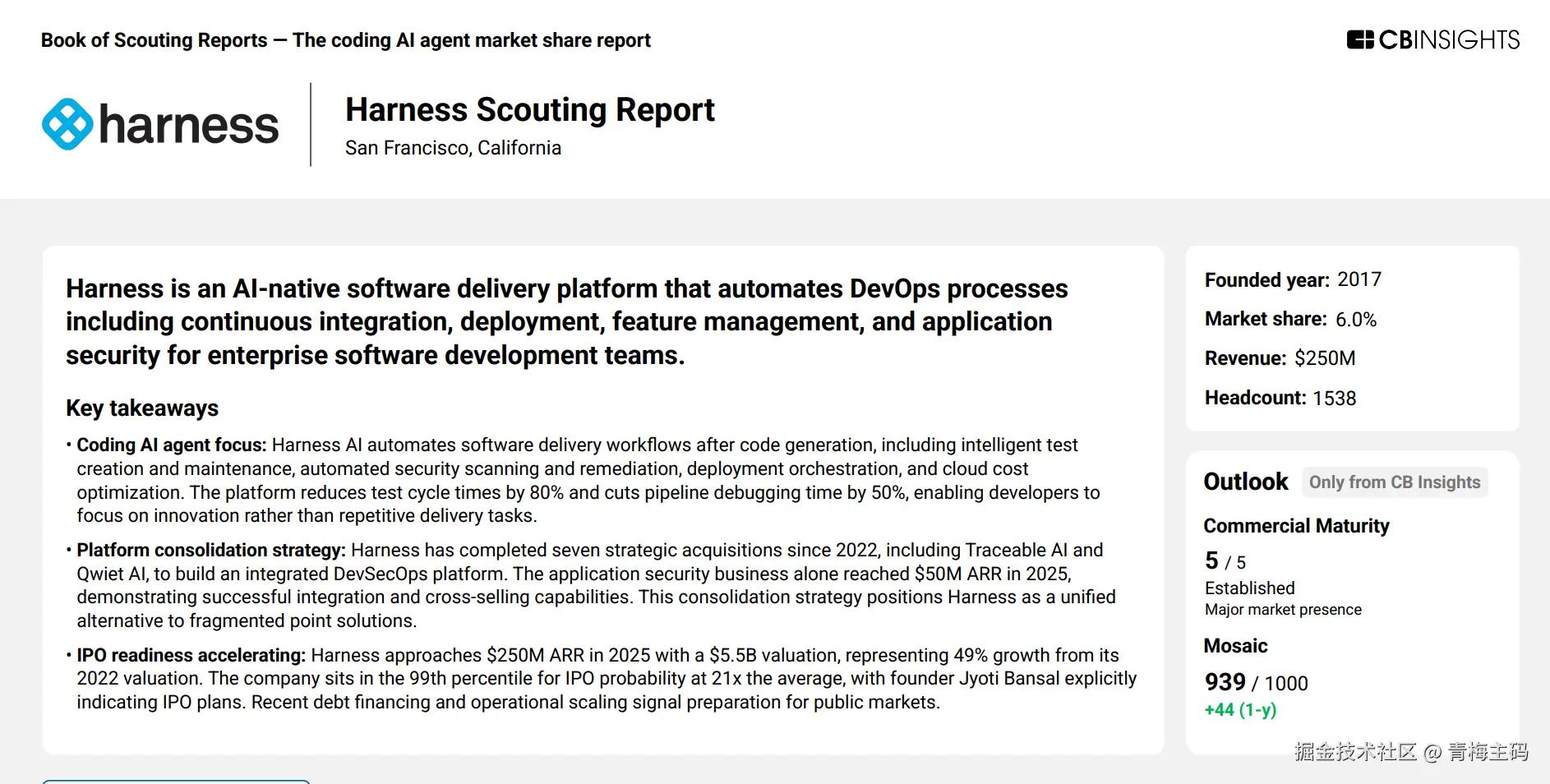- Harness:专注AI原生的软件交付平台,自动化测试、安全扫描与部署流程,2025年收入 2.5亿美元,市场份额 6%。通过多次收购,已构建完整 DevSecOps 平台,估值55亿美元,被视为最接近 IPO 的玩家之一。