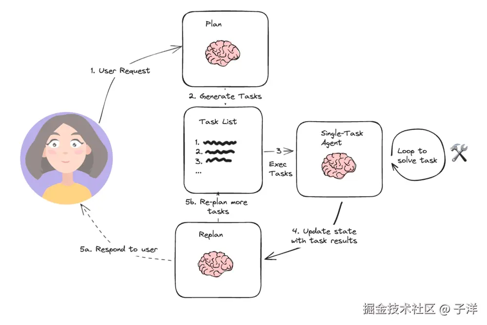 这张图来自 LangChain 博客,对 Plan and Execute 模式给出了一个非常工程化的抽象。从流程上看,它并没有试图强调模型怎么思考,而是把注意力放在任务是如何在不同阶段之间流转的:用户问题先进入规划阶段,被拆解成一组明确的步骤;随后这些步骤被依次交给执行模块处理;执行过程中持续产生中间结果,并由上层进行监控;一旦某一步失败,就会触发重新规划,再次回到 Plan 阶段。