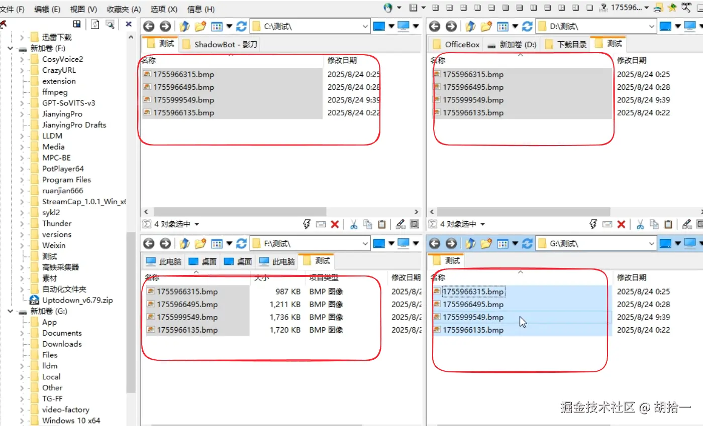 1、打开软件,就可以看到我同时打开了4个磁盘的目录,下面我将要把C盘准备的文件,分别转移到其他几个磁盘