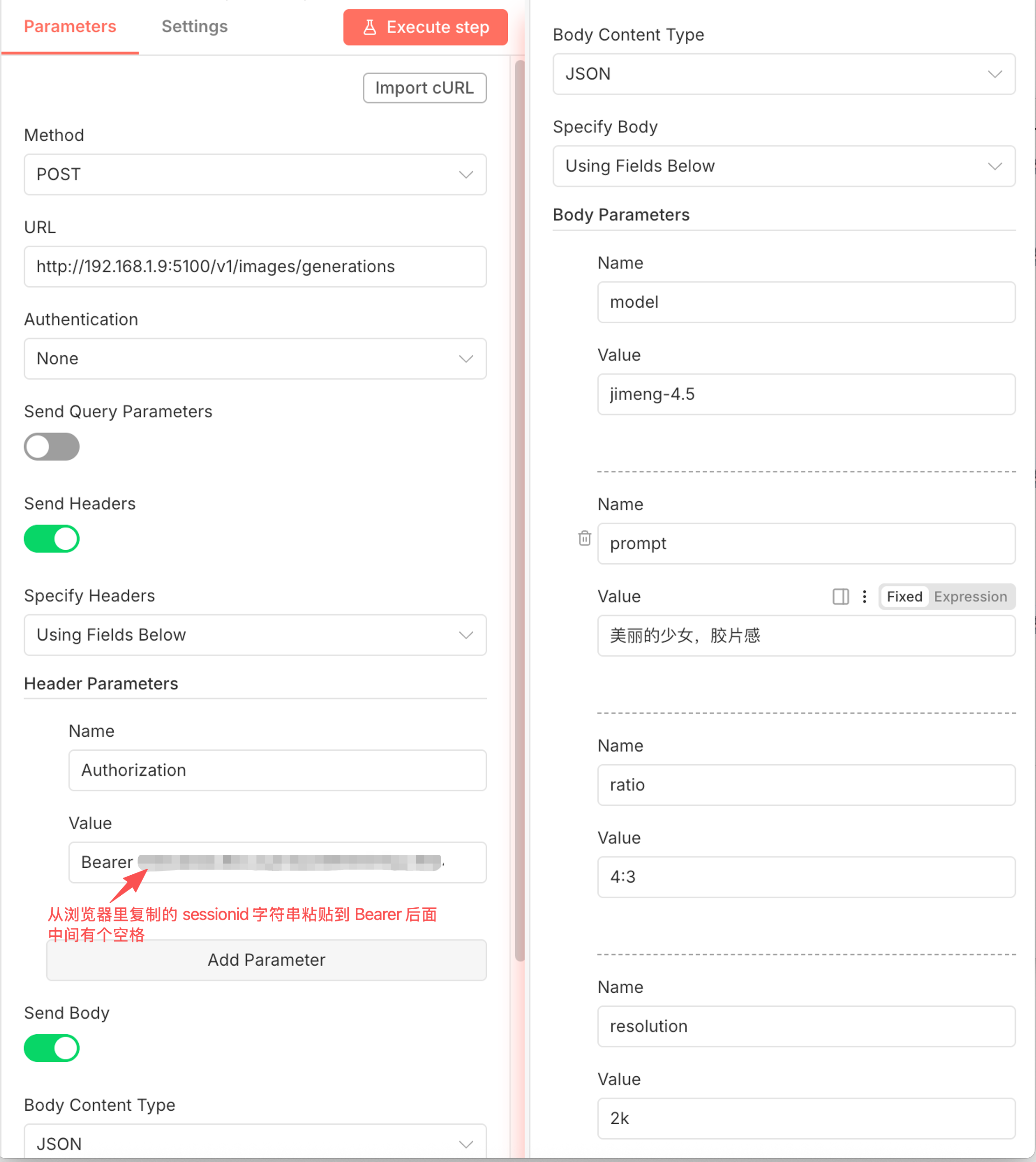 Authorization,值为Bearer加上刚才复制的sessionid(注意中间有个空格)。 - Body: 这里填生成参数,比如模型