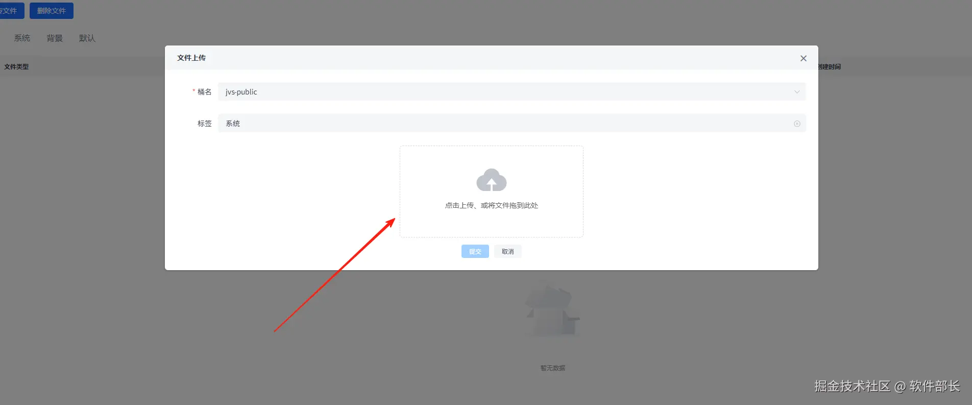 管理员登录系统进入管理后台-文件管理点击【上传文件】,输入桶名和标签,并将设置好的文档模板上传并点击【提交】。