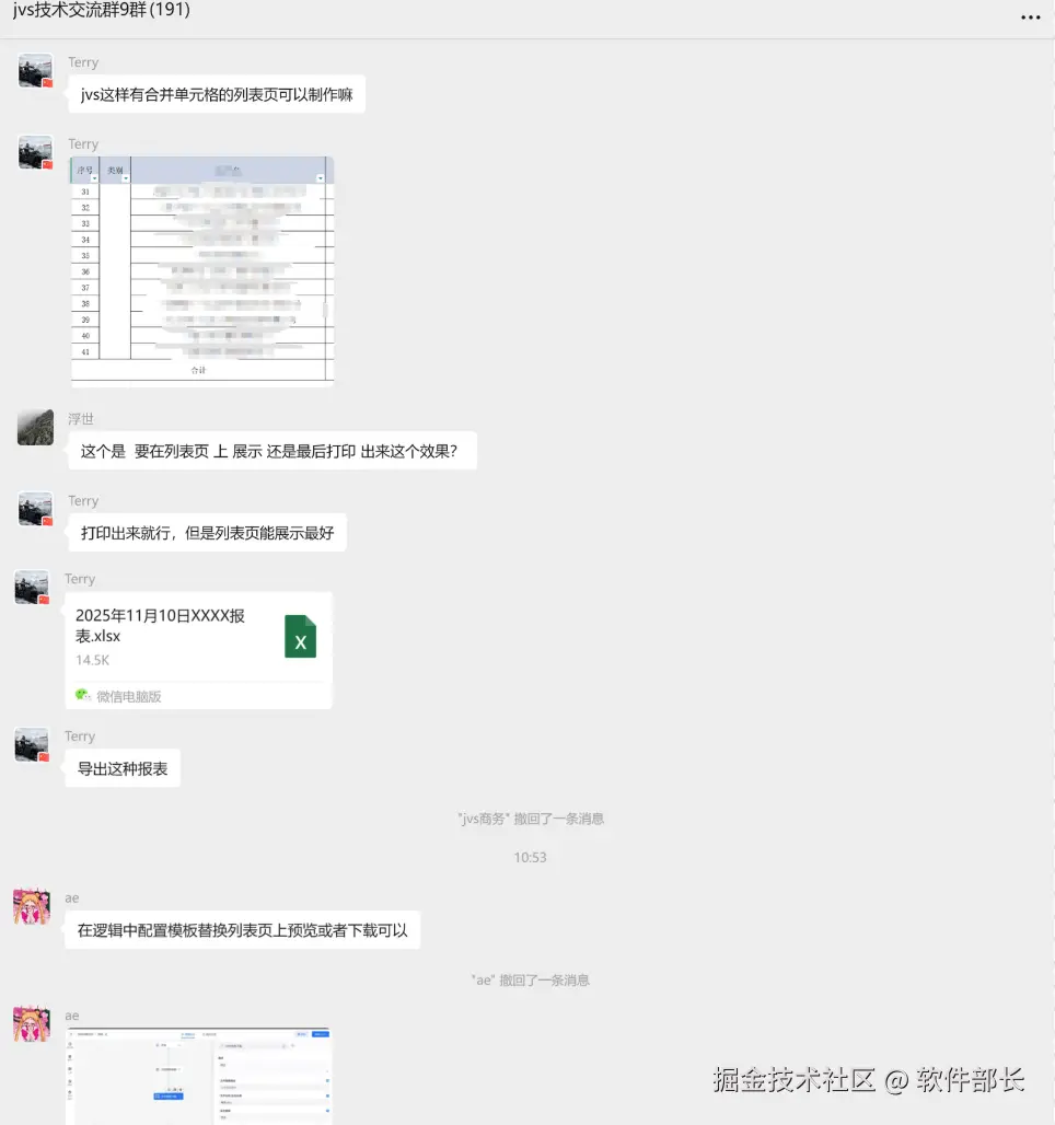这不,昨天在自家群看到有个用户在问JVS低代码能不能实现合并单元格的列表页制作和导出打印。