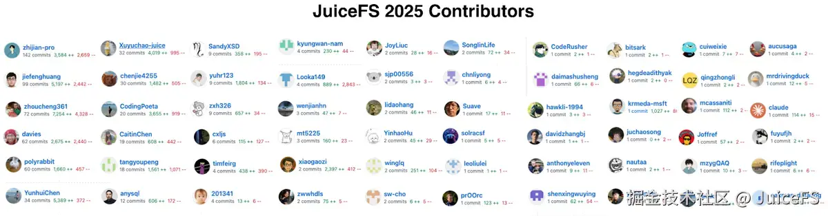 2025 年,JuiceFS 社区版继续聚焦通用性,尤其在支持各类 AI 场景的需求。发布了 Python SDK、增强 Windows 客户端可用性,并加强了对云原生生态的支持;此外,元数据引擎 SQL 和 TiKV 也进行了针对性优化。今年,团队与社区成员一道推动了 JuiceFS 的持续迭代,共有 60 位贡献者参与,新增了 305 个 Issue,合并了 601 个 PR。