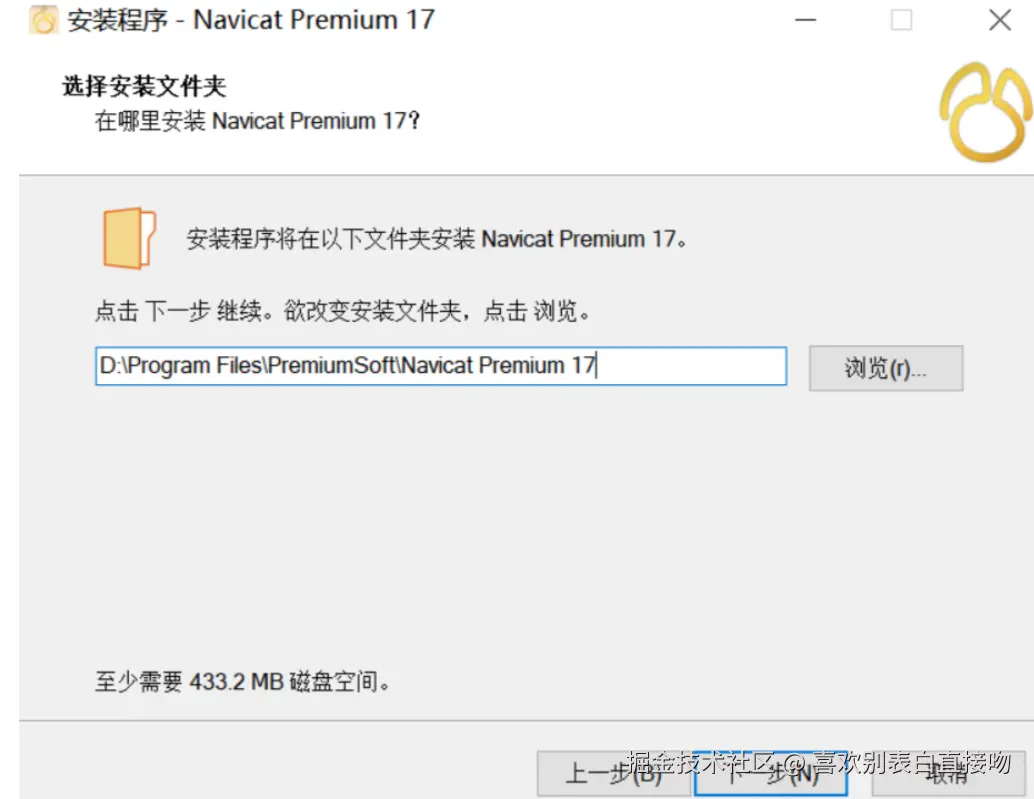 4.选择安装路径(默认 C 盘或改 D 盘,如 “D:\Program Files\Navicat 17”),点击 “下一步”(建议非系统盘,避免占用 C 盘空间)。