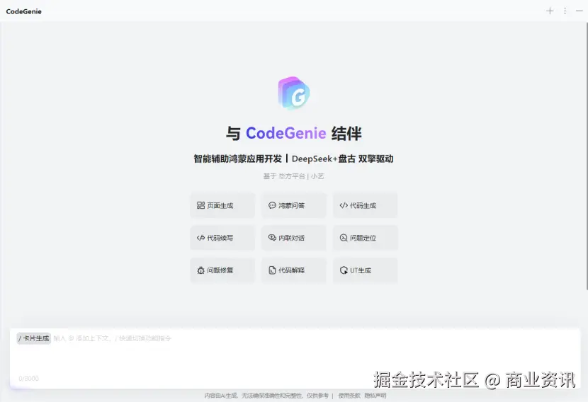 在 CodeGenie 输入框中输入 / 符号,会弹出功能菜单,选择 "卡片生成" 选项。这个功能专门针对鸿蒙卡片开发进行了优化。