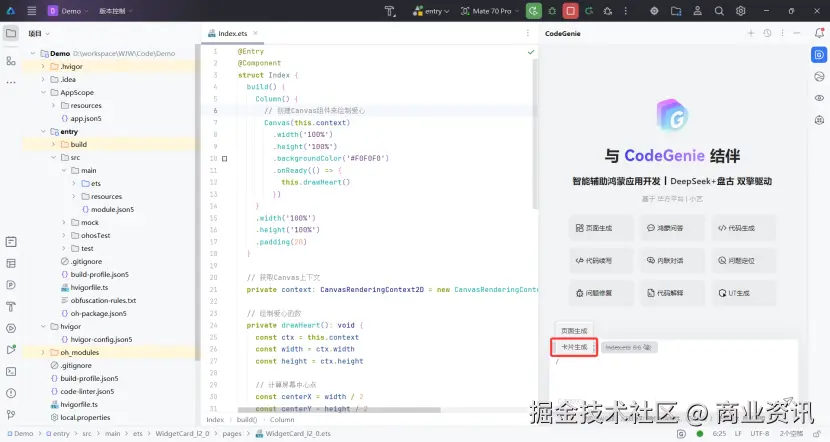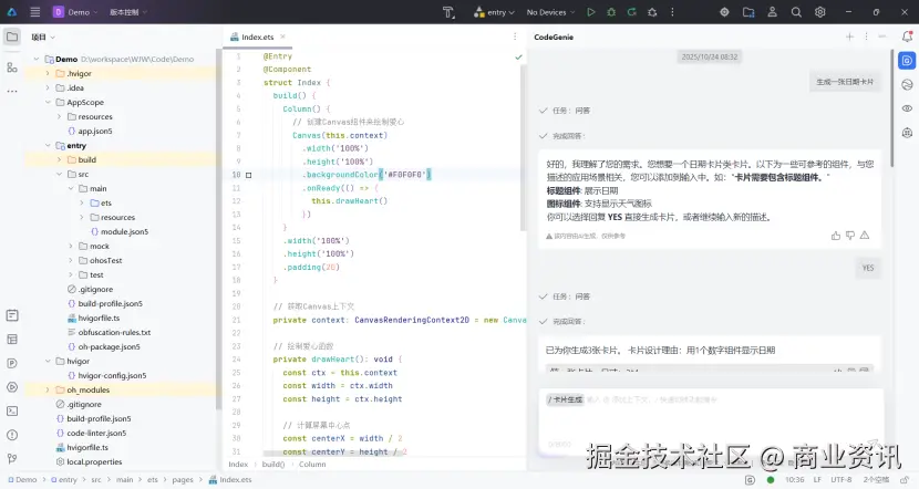 嗨,我是阿伟,一个热爱鸿蒙的开发者。在鸿蒙生态快速发展的今天,AI 辅助编程工具正在改变我们的开发方式。今天我要和大家分享的是如何使用 DevEco Studio 的 AI 助手 CodeGenie 来快速生成一张精美的日期卡片,整个过程仅需几分钟,效果却令人惊艳!