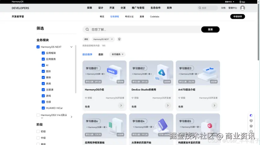 访问 华为开发者学堂,选择 “HarmonyOS” 板块,可免费注册学习。
