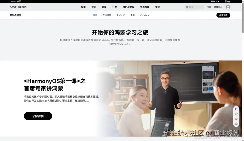 华为官方提供了鸿蒙(HarmonyOS)开发者学堂,包含系统化的课程和文档,适合从入门到进阶的学习需求。平台涵盖 HarmonyOS 应用开发、设备开发、分布式技术等核心内容,并提供实战案例和在线实验环境。