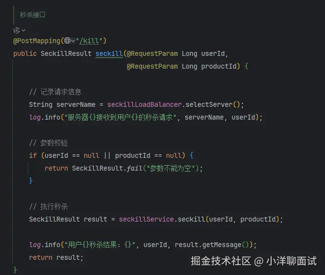 接着我们先定义真正的秒杀接口,这里注意一定要进行风控或者参数校验: