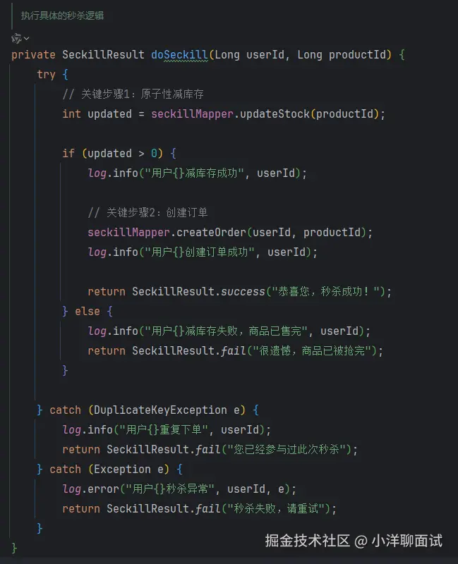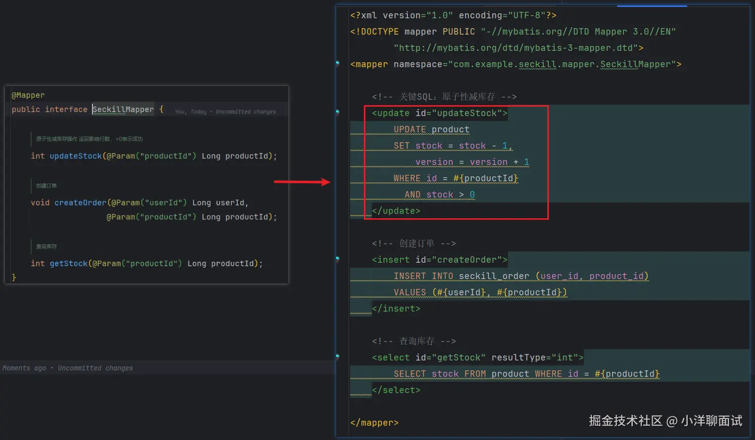 - updateStock是核心SQL,AND stock > 0 确保不会超卖