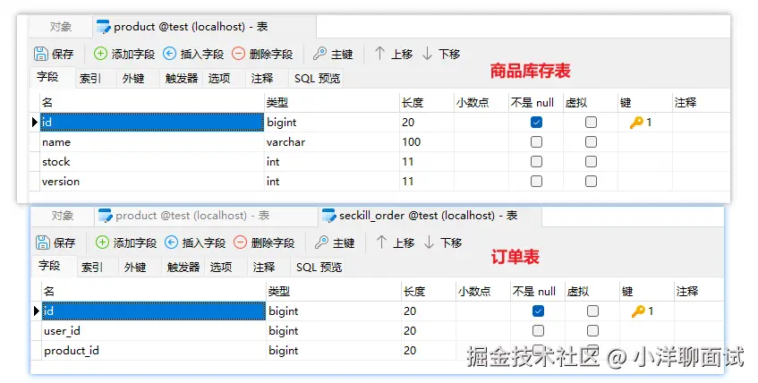 首先先设计一下数据库,简单一点,一张库存表,一张订单表: