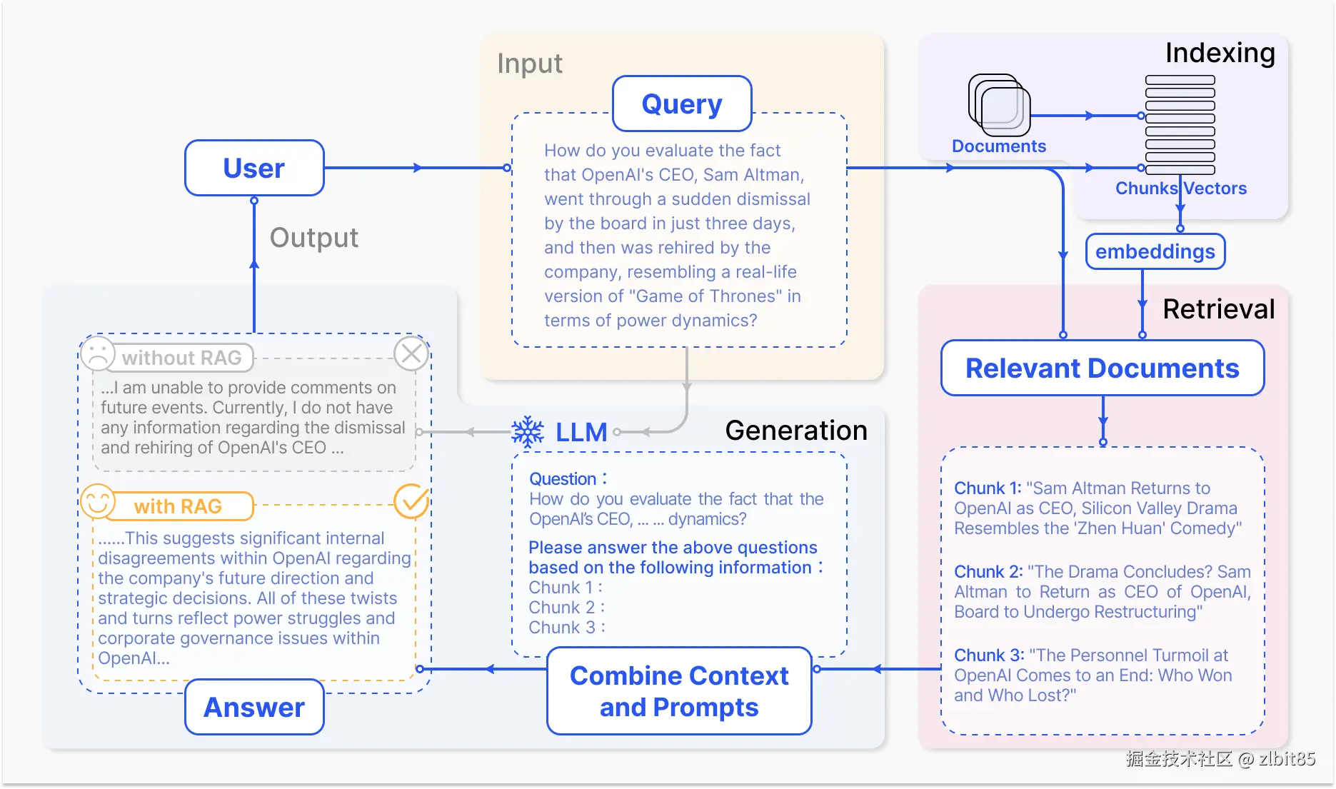 - 流程:从知识库中检索相关文档,将其与用户查询一并提供给LLM以生成最终响应。