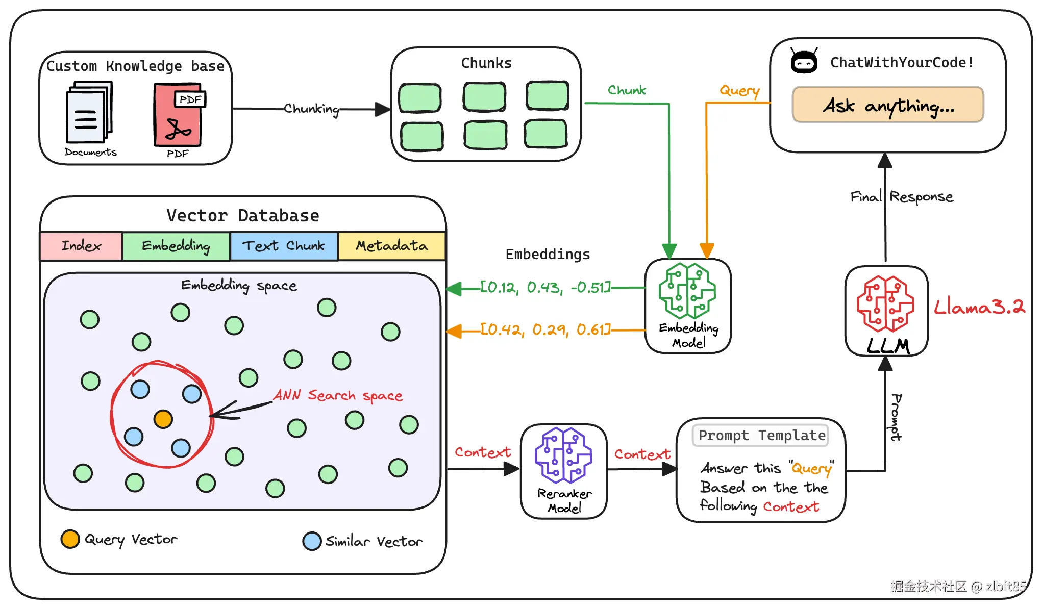 当用户提出问题时,系统会使用与处理知识块相同的嵌入模型,将查询也转换为高维向量(即查询向量)。这使得问题与知识块处于同一语义空间,机器可通过计算向量相似度找到最相关的知识。