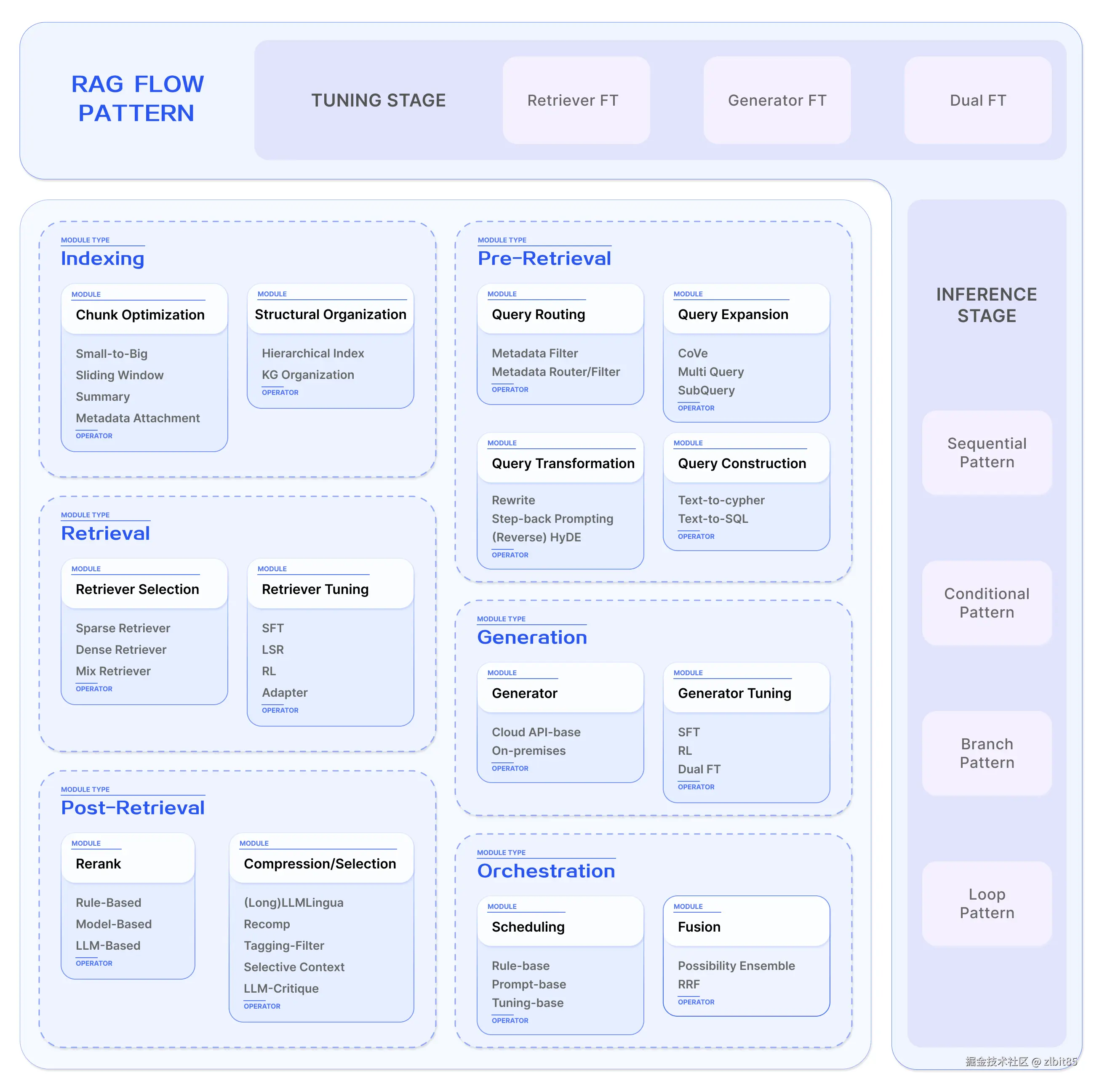 - 新模式:支持模块的自定义编排(如 Rewrite-Retrieve-Read、Iter-RETGEN 等流程),可适配不同任务(知识密集型、多轮对话等)。