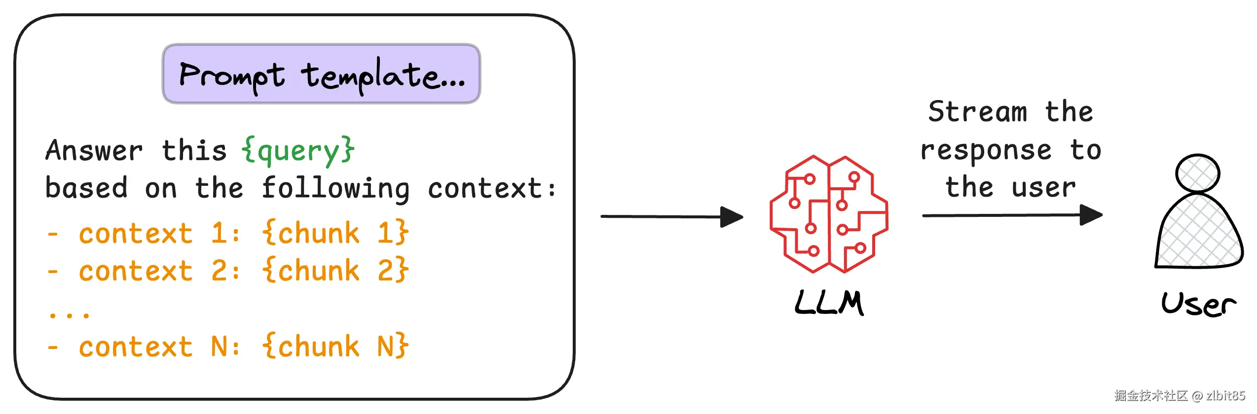 - 生成:将检索到的文本片段与原始查询组合成增强提示,输入LLM以生成最终答案。