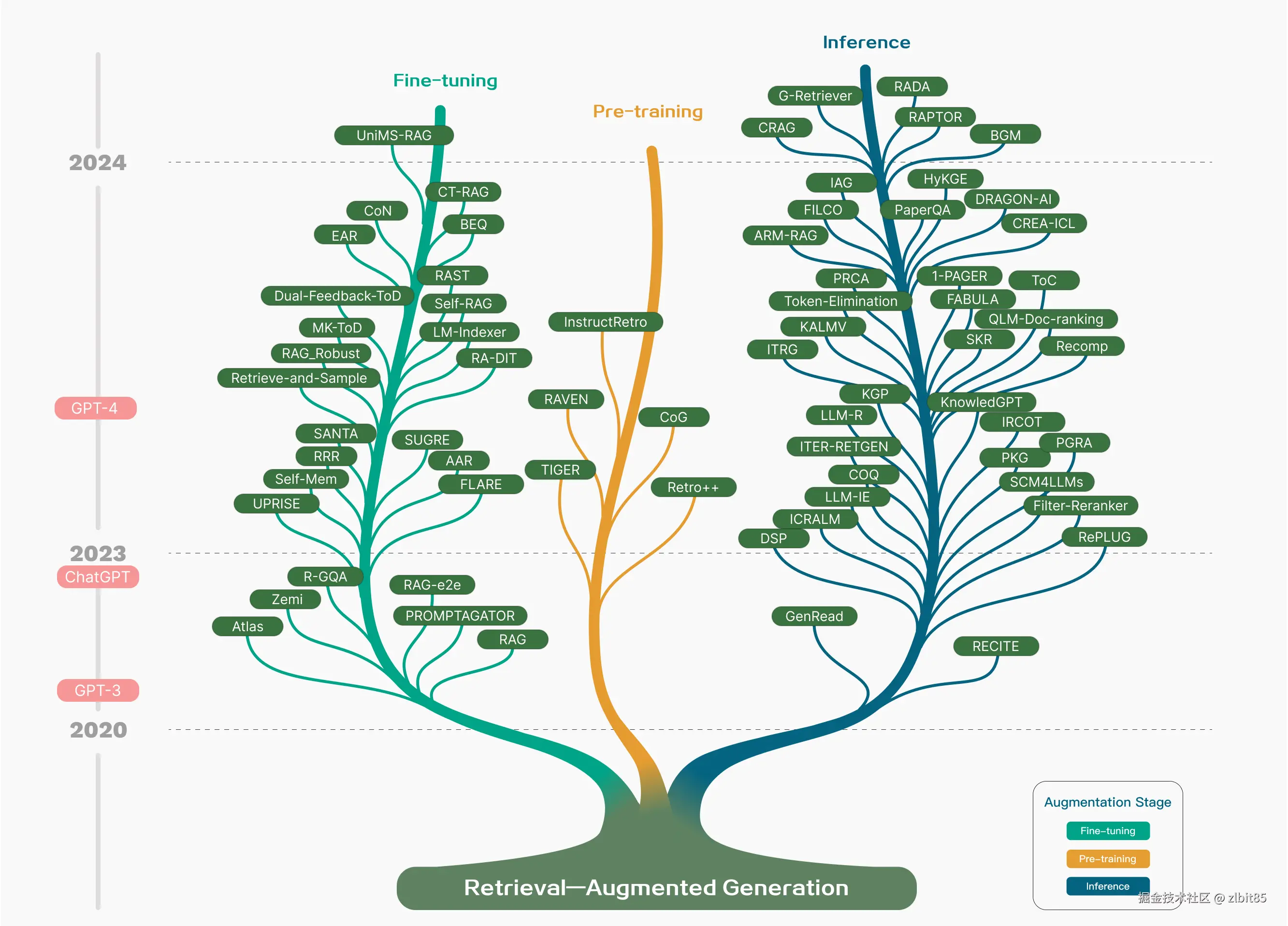 涉及RAG的阶段主要包括预训练、微调和推理。随着LLM的出现,RAG研究最初聚焦于利用LLM强大的上下文学习能力,主要集中在推理阶段。后续研究深入探讨,逐步与LLMs的微调相结合。研究人员还在探索通过检索增强技术提升预训练阶段的语言模型。